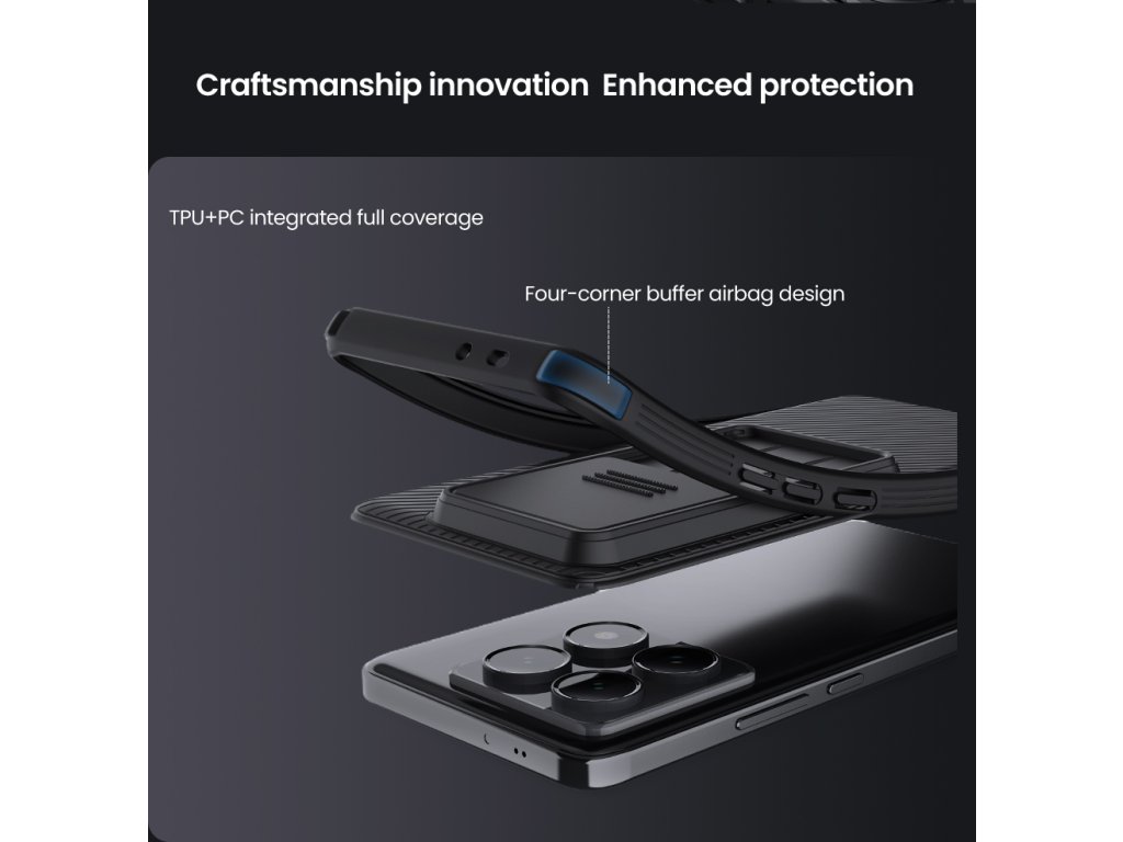 Nillkin CamShield PRO je unikátní kryt s posuvným krytem čočky fotoaparátu. Navíc je oproti klasickému CamShield unikátní v tom, že se skládá ze dvou materiálů. Záda krytu jsou vyrobena z pevného a odolného plastu a to včetně krytu fotoaparátu. Rámeček krytu je vyroben z měkčeného TPU plastu, pro nejlepší ochranu okrajů a rohů telefonu. Oba dva materiály jsou vysoce odolné proti opotřebení, ale také proti otiskům prstů a mastnotě. Přesné výřezy na ovládací prvky a potřebné konektory zajišťují pohodlnou obsluhu telefonu. Vlastnosti: - materiál rámečku TPU - materiál zadní strany PC - posuvný kryt pro ochranu čočky fotoaparátu - perfektně padne na daný typ telefonu - měkčený rámeček pro maximální ochranu
