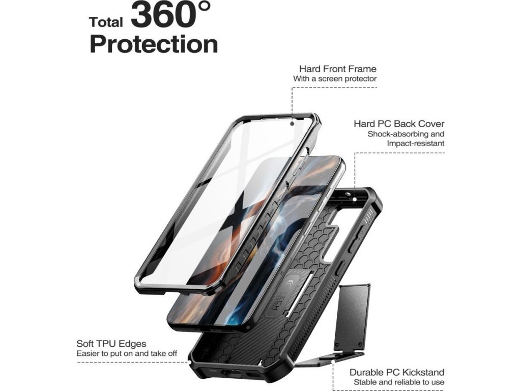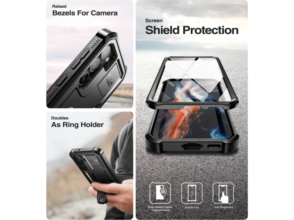 Dvoudílné pouzdro kombinuje pevný zadní pancíř vyrobený z PC skořepiny a nárazuvzdorného TPU. Dodatečná výztuha v rozích - ochranné airbagy - účinně absorbují každý pád. Přední strana zařízení je kryta rámem s integrovaným polykarbonátovým krytem. Toto řešení dokonale odděluje displej a chrání jej před poškrábáním.