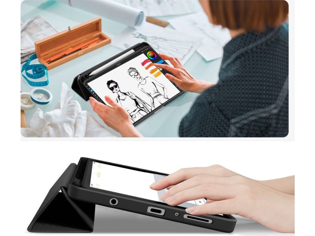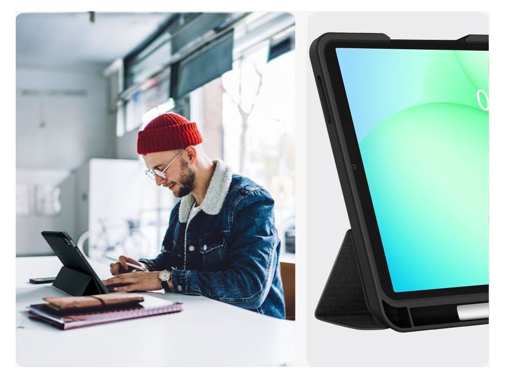 Hlavním prvkem pouzdra je speciální držák na Apple Pencil, který udržuje stylus bezpečně uložený a vždy po ruce. Pouzdro lze také použít jako stojánek, který vám umožní umístit iPad do různých poloh – pro pohodlné sledování filmů, čtení nebo psaní. Další funkcí je automatické uspání a probuzení při otevření nebo zavření pouzdra.