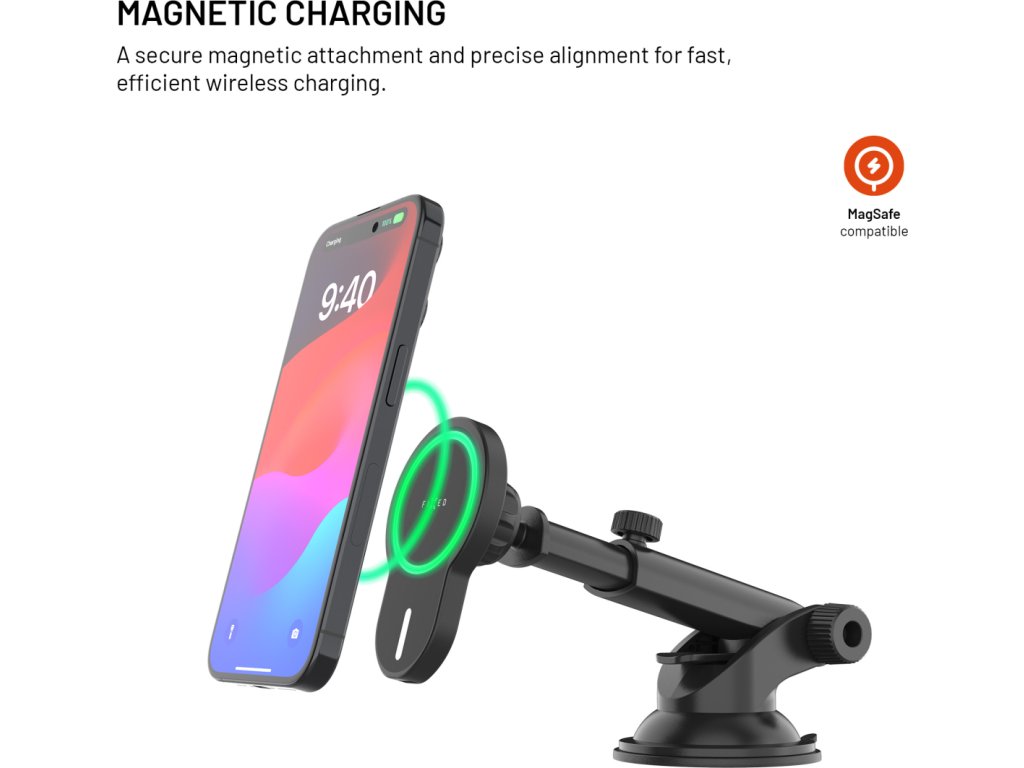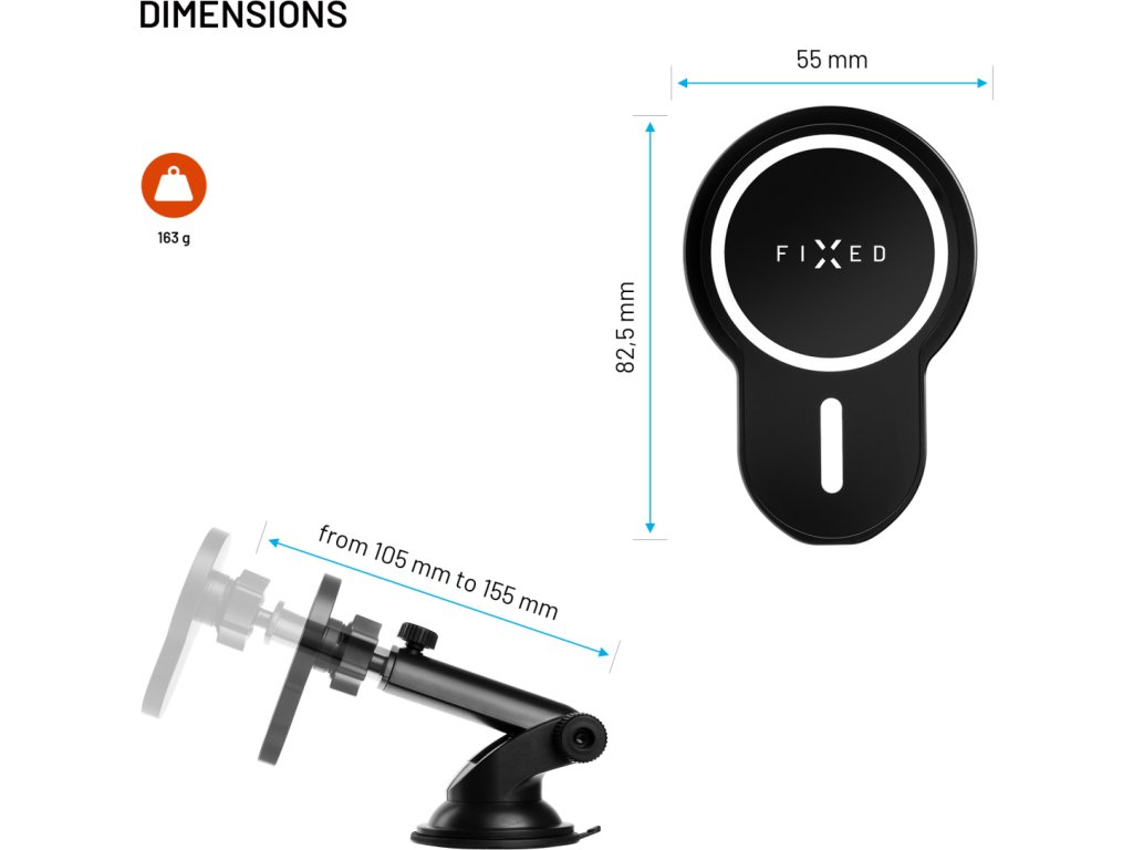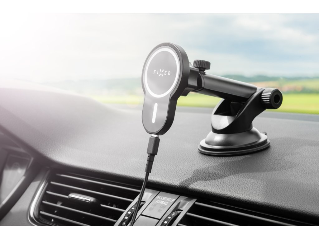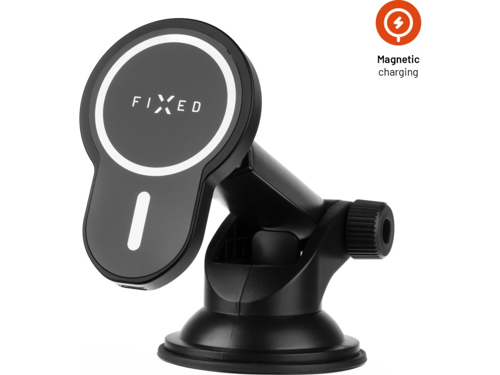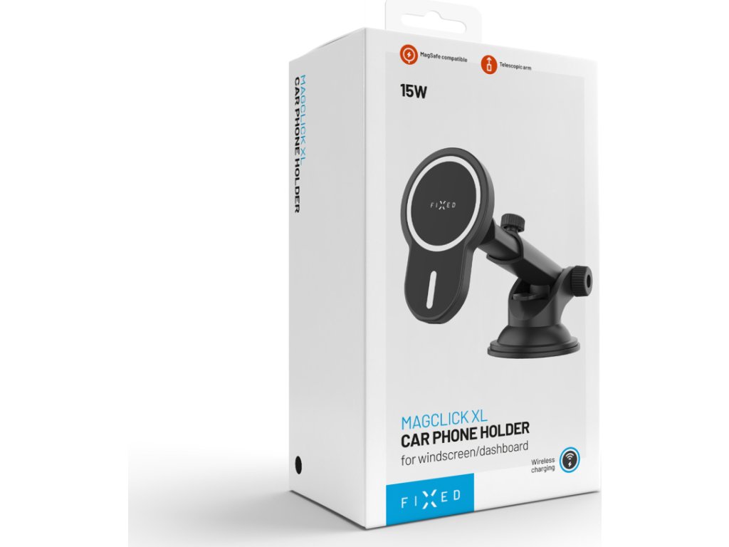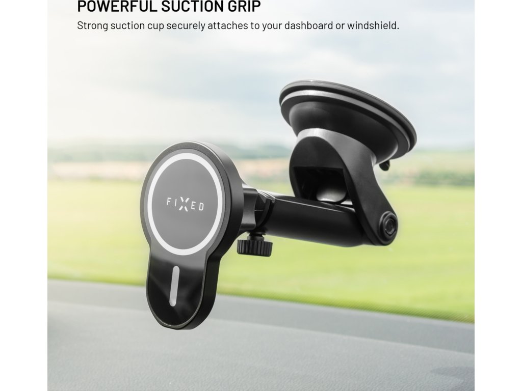 Držák s bezdrátovým nabíjením FIXED MagClick XL s podporou uchycení MagSafe, na sklo nebo palubní desku, 15W, černý