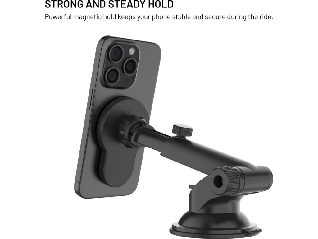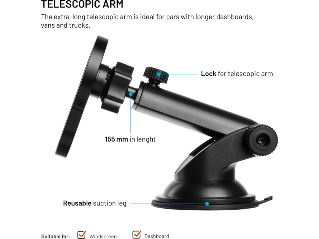 Držák FIXED MagClick XL s prodlouženou nohou vyvinutý přímo pro nejnovější Apple iPhone s funkcí MagSafe vám umožní mít telefon v autě pěkně na očích a zároveň ho pohodlně dobíjet během jízdy. Díky integrovaným magnetům stačí jen přiložit telefon k držáku a pomocí MagSafe se okamžitě sám zajistí. Drží bezpečně a bez problémů vydrží všechny otřesy způsobené jízdou. Pro rychlé nabíjení vašeho iPhonu je držák MagClick vybaven vysoce výkonnou cívkou s výkonem 7,5W a až 15W pro ostatní chytré telefony, dokáže tak doplnit energii v co nejkratším čase. Držák je určen pro uchycení pomocí přísavné základny na sklo i palubní desku. Pomocí otočného kloubu a nastavitelného ramene si nastavíte telefon do ideálního úhlu tak, aby byl v případě potřeby pěkně na očích. S držákem FIXED MagClick bude vaše jízda s telefonem v autě pohodlnější a hlavně bezpečnější než kdy dříve.