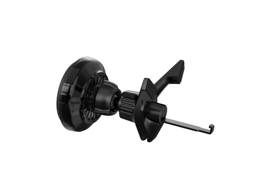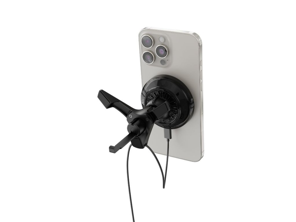 Chladící magnetická bezdrátová nabíječka do auta s oficiální Qi2.2 25 W certifikací a podporou MagSafe. Nabije iPhone z 0 na 50% za 25 minut¹ bez přehřívání díky integrovanému ventilátoru. Univerzální montáž do ventilace. Extra silný magnet. Možnost volby barvy nebo vypnutí podsvícení.