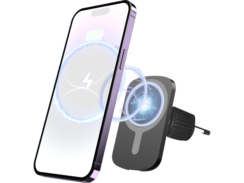 Magnetický držák Swissten do větrací mřížky s bezdrátovým dobíjením kompatibilním s MagSafe a vysokým výkonem 15W. Baleno v blistru SWISSTEN.