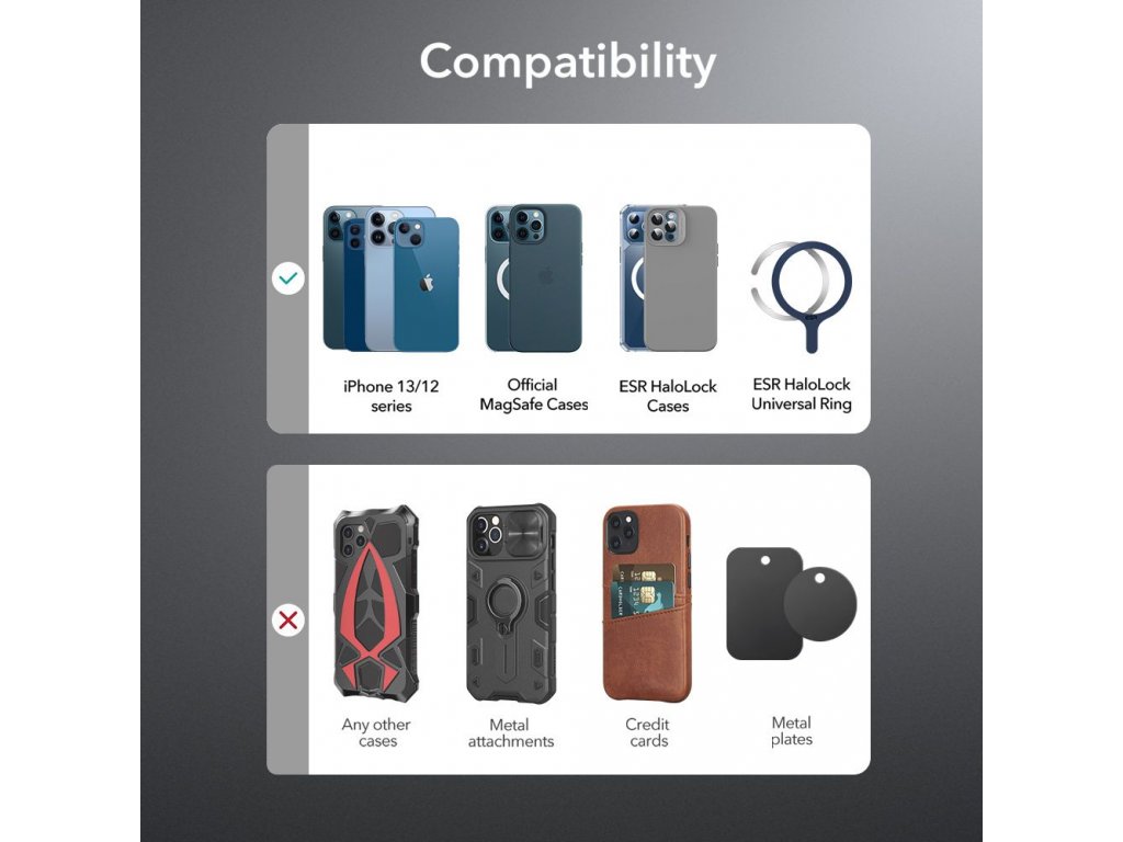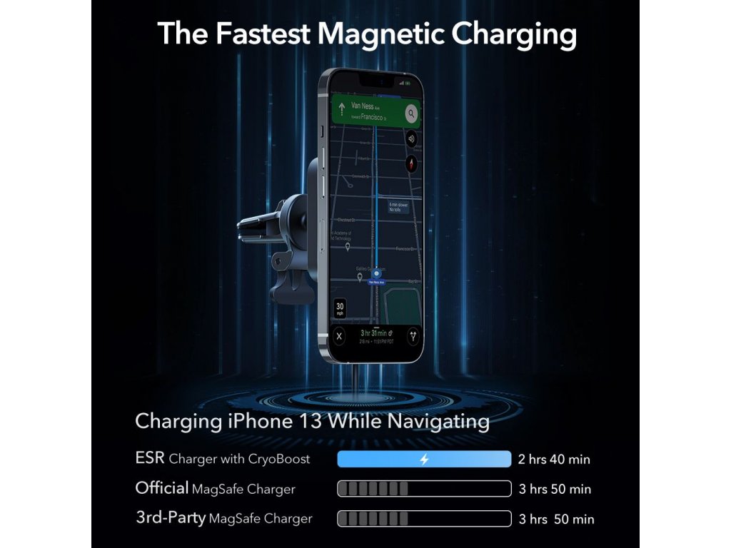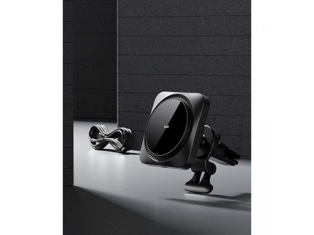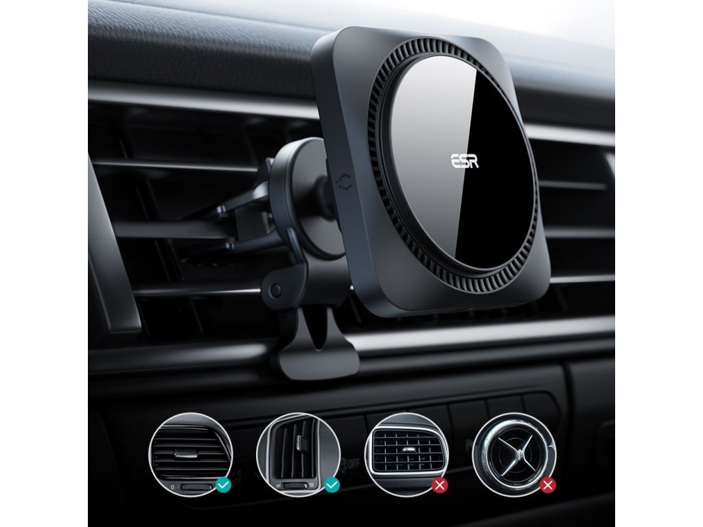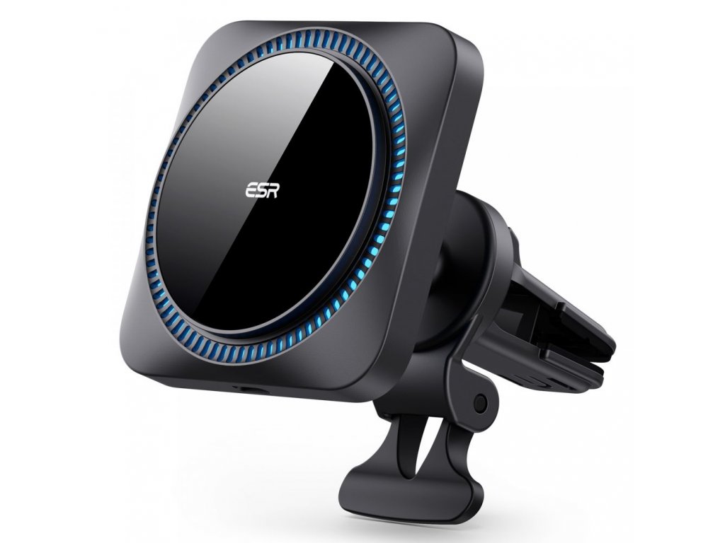 ESR Halolock CryoBoost je kombináciou praktického držiaka do auta namontovaného na mriežke ventilácie a superrýchlej bezdrôtovej nabíjačky , ktorá podporuje technológiu MagSafe pre telefóny iPhone radu 12, 13 a novšie s podporou MagSafe .