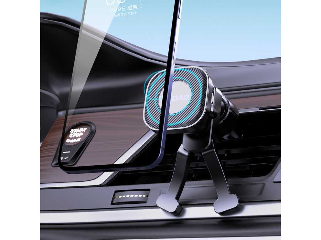 Magnetický držák do auta k montáži na ventilační mřížku vozu. Extrémně snadno se používá, stačí na něj telefon položit a silné magnety jej okamžitě přitáhnou k sobě. Má trojúhelníkovou konstrukci, která zajišťuje stabilitu při jízdě, skvělé možnosti nastavení (včetně rotace o 360 stupňů) a gumové kryty, které zabraňují poškrábání vzduchem. Snadno na něj položíte telefon připojený k nabíječce kabelem, nic vám během jízdy nepřekáží v autě.