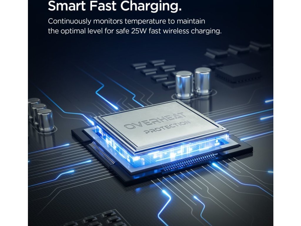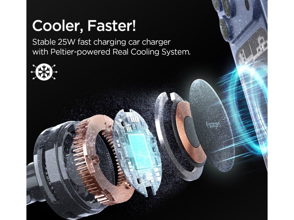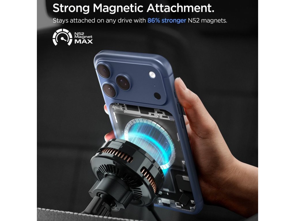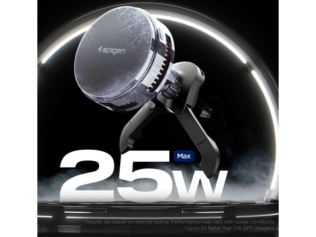 Spigen ESSentional EV25MFAQ je moderní prémiový držák do auta, který kombinuje efektivní bezdrátové nabíjení s výjimečnou stabilitou a pokročilým chladicím systémem. Zařízení podporuje nejnovější standard Qi 2.2 a poskytuje výkon až 25 W, což zajišťuje rychlé a efektivní nabíjení kompatibilních smartphonů Magsafe, které využívají plný potenciál této technologie.