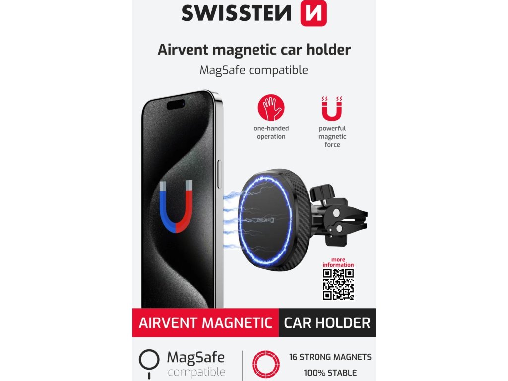 Magnetický držák Swissten do větrací mřížky s bezdrátovým dobíjením kompatibilním s MagSafe, vysokým výkonem 15W a odpojitelným kabelem. Baleno v blistru SWISSTEN.