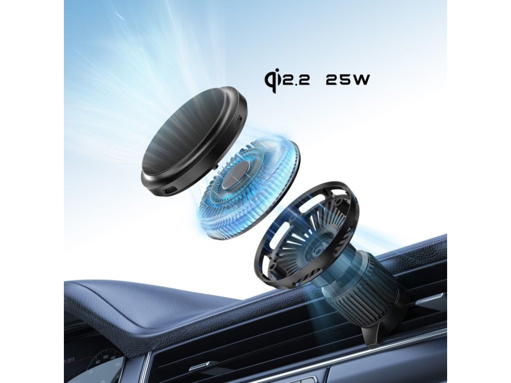 Bezdrátová nabíječka do auta Tech-Protect V9 je pokročilé řešení, které kombinuje magnetickou technologii MagSafe s ultrarychlým 25W Qi2.2 nabíjením. Díky aktivnímu chlazení efektivně snižuje teplotu telefonu během intenzivního nabíjení.
