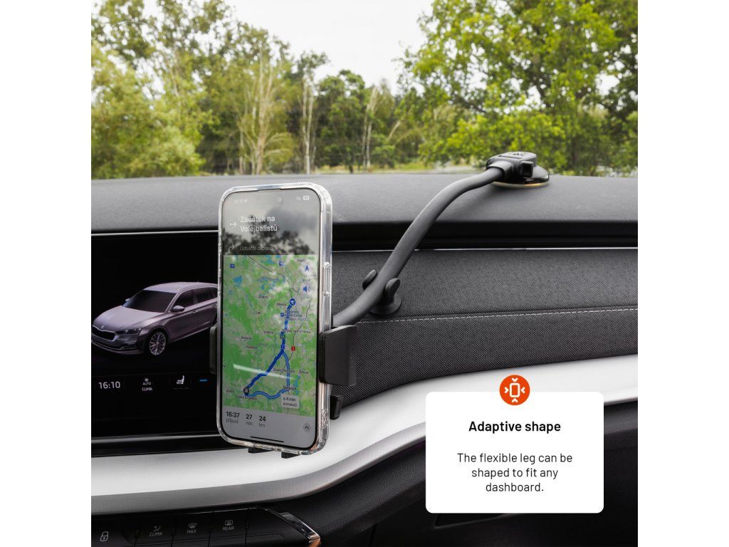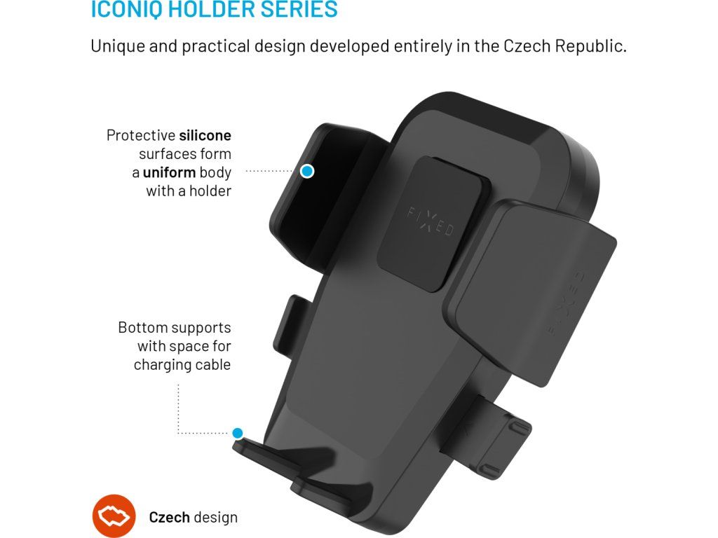Univerzální držák do auta FIXED Iconiq Flex XL s rychloupínacím systémem Push and grip nabízí bezpečné a jednoduché uchycení telefonu, které zvládnete jednou rukou. Držák je kompletně vyvíjený v České republice a nabízí tichý a plynulý mechanismus v kombinaci s minimalistickým funkčním designem. Telefon stačí lehce přitisknout na plochu držáku a boční kleště se automaticky přizpůsobí velikosti telefonu do šířky až 8,3 cm. Jediným stiskem se telefon stejně rychle uvolní. Stabilita upevněného telefonu je zespodu zajištěna zkosenými opěrkami, které nebrání přístupu k nabíjecímu konektoru. Tělo držáku je kombinací tvrzeného plastu a ochranných silikonových prvků, které tvoří jeden celek. Flexibilní rameno držáku lze umístit na čelní sklo či palubní desku pomocí přísavného podstavce. Přísavný podstavec vydrží všechny otřesy a silnou přilnavost neztrácí ani při opakovaném uchycení. Ideální pozorovací úhel zajistí rameno o délce až 29 cm, které lze libovolně ohýbat či zajistit přídavným úchytem s pevnou 3M páskou. Organizaci kabelů usnadňují odnímatelné úchyty na zadní straně držáku. S držákem FIXED Iconiq Flex XL si užijte každou jízdu bez starostí.