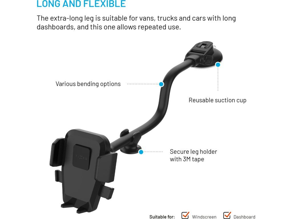 Univerzální držák do auta FIXED Iconiq Flex XL s flexibilní ohebnou nohou na sklo nebo na palubní desku, černý