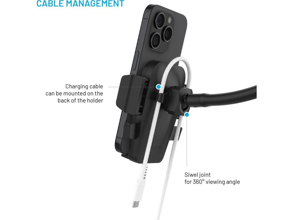 - odnímatelné úchyty pro nabíjecí kabel na zadní straně držáku
