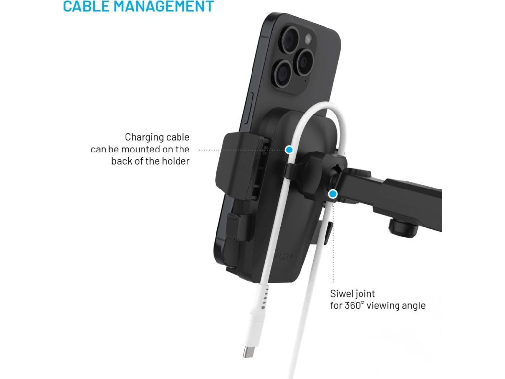 - odnímatelné úchyty pro nabíjecí kabel na zadní straně držáku