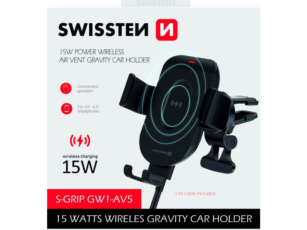 Držák S-GRIP GW1-AV5 s výstupním výkonem 15W a sofistikovaným gravity mechanismem pro upevnění smartphonu. Baleno v blistru SWISSTEN