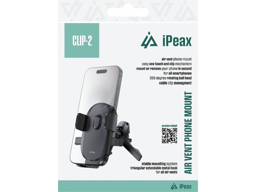Mechanický držák iPEAX CLIP-2 s uchycením do ventilační mřížky a uvolněním pomocí zadních paciček. Stabilní, bez elektroniky, univerzální. Zabaleno v iPEAX balení.