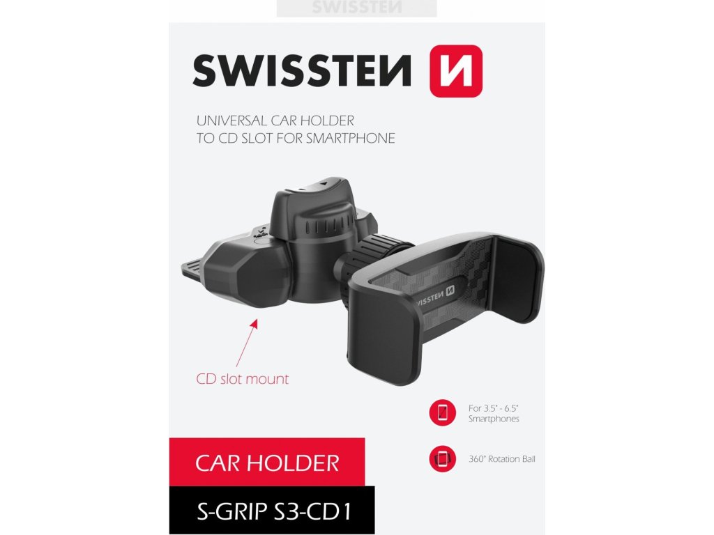 Držák do auta SWISSTEN S-GRIP S3-CD1 je určen pro instalaci do slotu CD přehrávače. Čelisti držáku mají rozpětí až 85mm. Baleno v blistru Swissten.