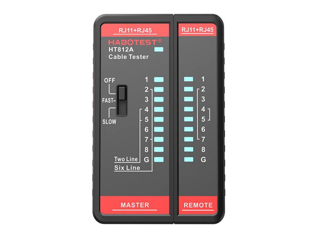 Pomocí testeru kabelů Habotest HT812A úspěšně získáte informace o výkonu kabelů s konektory RJ11 a RJ45. Snadno zkontrolujete hodnoty výkonu telefonních a síťových kabelů. Přístroj se vyznačuje kompaktním rozkládacím provedením. Napájí se ze 2 baterií typu AAA.