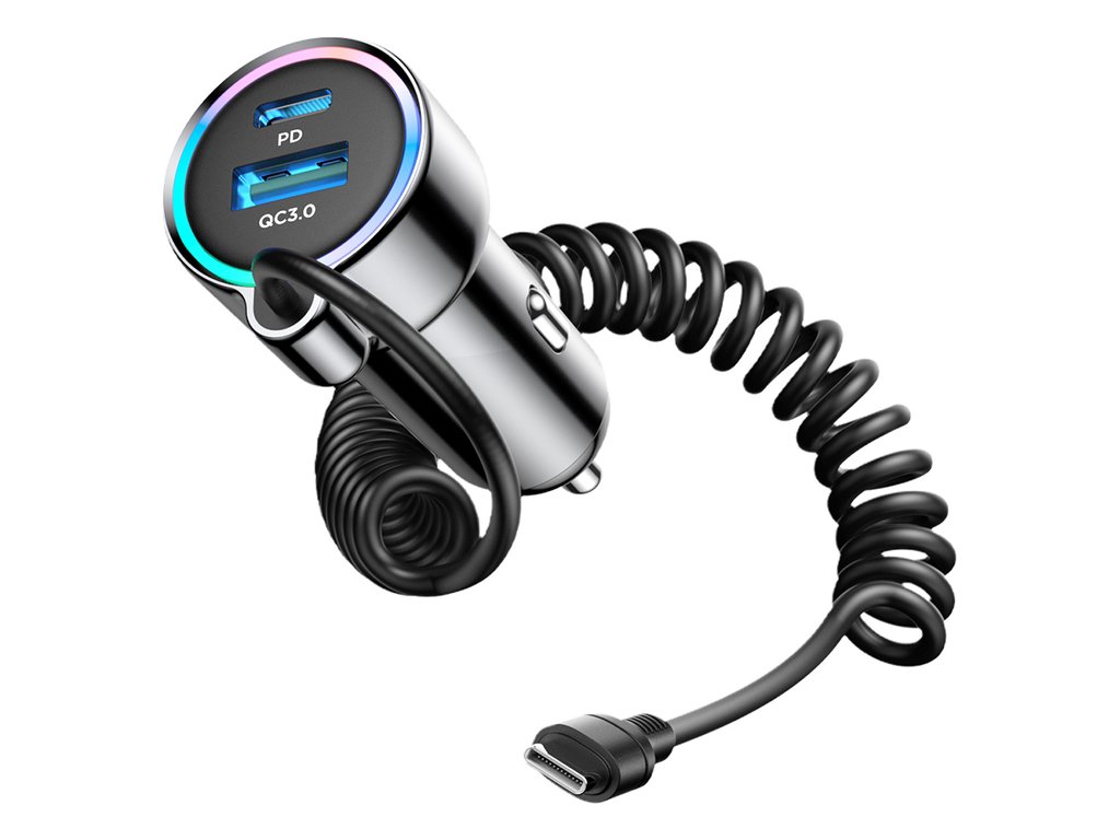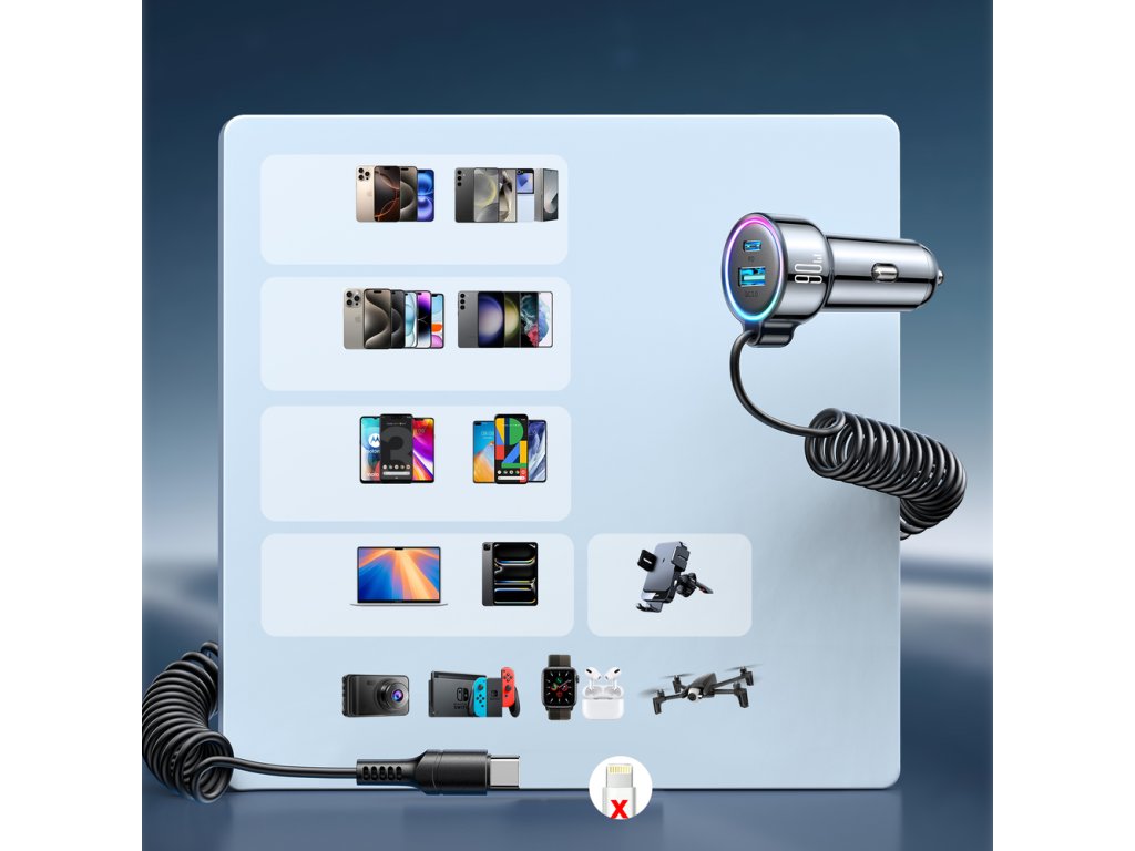 Joyroom JR-CL07 is a multifunctional 3-in-1 car charger that delivers up to 72W of power to ensure fast and safe charging of up to three devices at the same time. Equipped with two ports - USB-A and USB-C - and an integrated 1.6-meter USB-C cable, it eliminates the need to take additional accessories. Compatible with 12-24 V installations, it works great in both passenger cars and trucks. It supports the most popular fast charging protocols - PPS, QC and PD - which translates into instant energy replenishment in modern smartphones and tablets. The compact design and low weight of 56 g make it exceptionally handy and convenient in everyday use. The fireproof PVC housing increases safety and durability, and different voltage and current levels allow adaptation to different devices. This is a solution for drivers who expect reliability, functionality and high power - without compromise.
