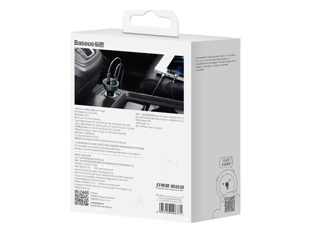 Nabíjačka do auta Baseus Qualcomm, USB, 2x USB-C, 160 W (sivá)