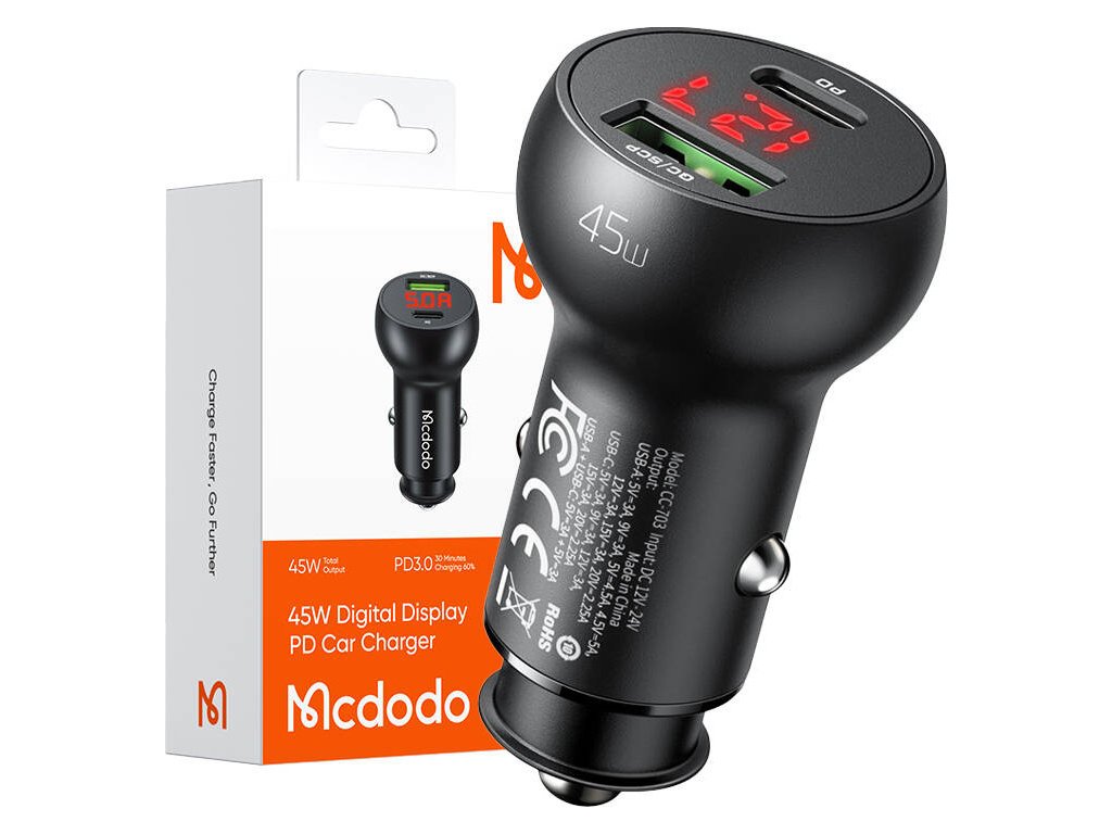 Nabíječka do auta Mcdodo CC-7030, USB + USB-C, s displejem, 45 W (černá)