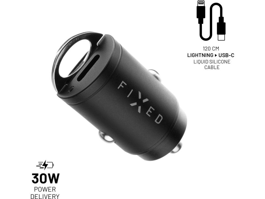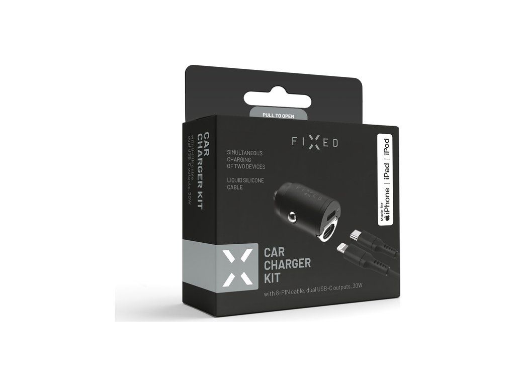 Set autonabíječky FIXED s 2xUSB-C výstupem a USB-C/Lightning kabelu, podpora PD, 1,2 metr, MFI, 30W, černý