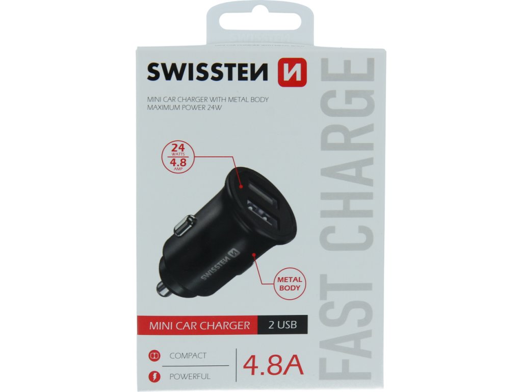 Elegantní metalický adaptér do zapalovače z modelové řady SWISSTEN.Optimální nabíjecí řešení do vašeho automobilu.Dva USB porty s celkovým výstupním proudem 4,8A (2,4A a 2,4A) dovolují pohodlně a rychle nabíjet 2zařízení najednou.Baleno v blistru Swissten