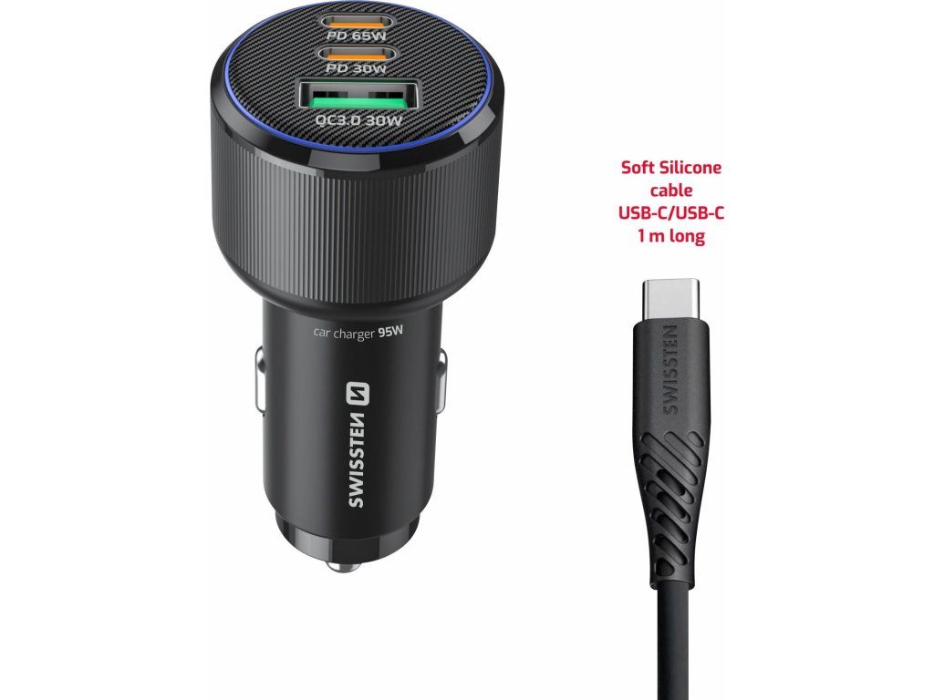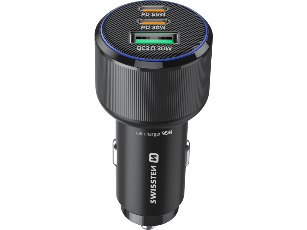 Autonabíječka Swissten 95W s USB-C kabelem, Porty: 2× USB-C + USB-A, Max. výkon USB-C1: 65W, Max. výkon USB-C2: 30W, Max. výkon USB-A: 30W, Vhodná pro notebooky, Modré LED světlo, Váha: 30 g, Rozměry: Průměr 3,25 × 7,39 cm. Baleno v blistru Swissten.