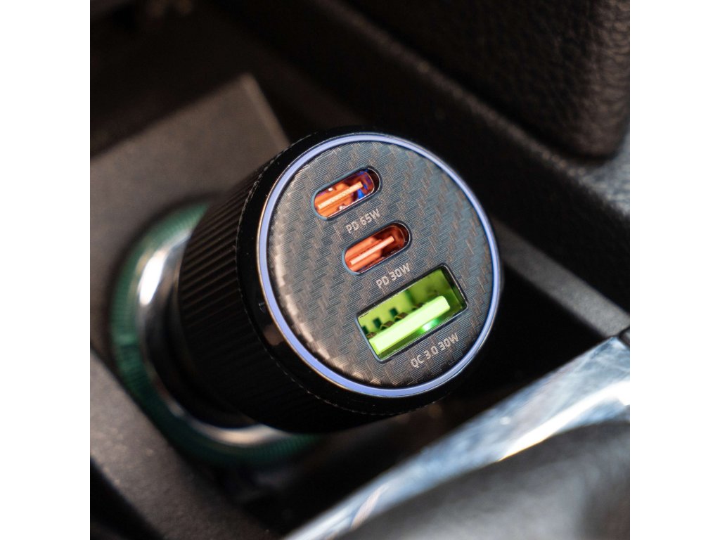 Výkonná autonabíječka s podporou PD 3.0 a QC 4.0, která zvládne dobíjet až tři zařízení současně s celkovým výkonem až 95 W. Ideální pro notebooky, tablety a smartphony. Modrý LED prstenec usnadňuje připojení kabelů i při jízdě v noci.