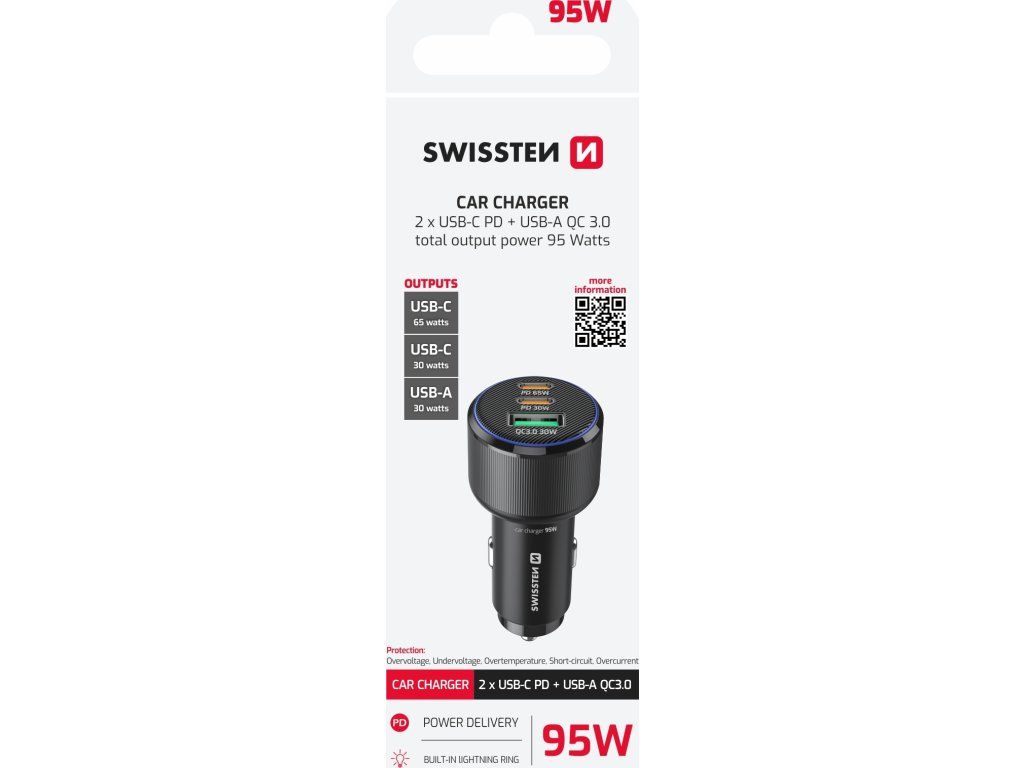 Autonabíječka Swissten 95W, Porty: 2× USB-C + USB-A, Max. výkon USB-C1: 65W, Max. výkon USB-C2: 30W, Max. výkon USB-A: 30W, Modré LED světlo, Váha: 30 g, Rozměry: Průměr 3,25 × 7,39 cm. Baleno v blistru Swissten.