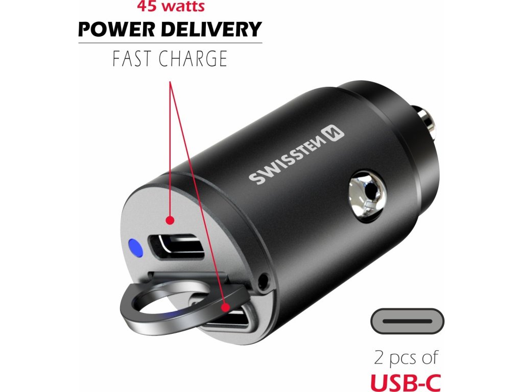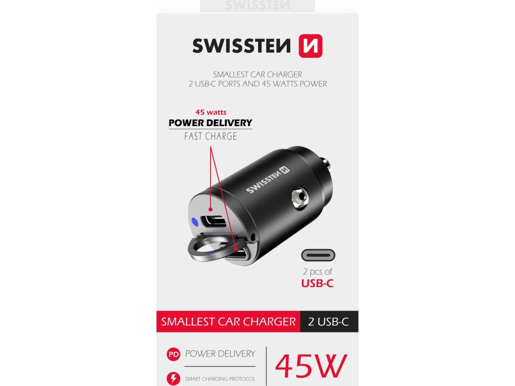 Nano autonabíječka SWISSTEN s výstupy 2x USB-C Power Delivery s celkovým výstupním výkonem 45W. Baleno v blistru SWISSTEN.