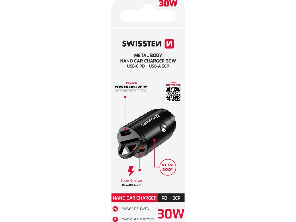 Nano autonabíječka SWISSTEN s výstupem USB-C Power Delivery a USB SuperCharge. Celkový výstupní výkon 30W. Baleno v blistru SWISSTEN.