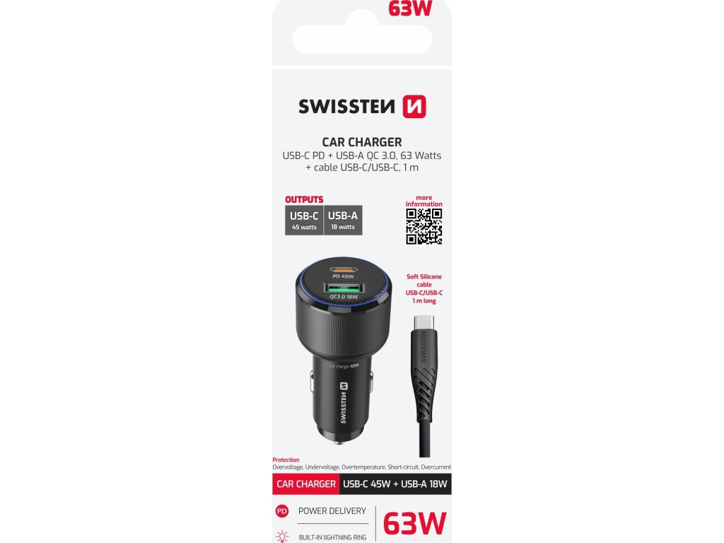 Autonabíječka Swissten 63W s kabelem, Porty: USB-C + USB-A, Max. výkon USB-C: 45W, Max. výkon USB-A: 18W, Kabel: USB-C/USB-C 1m 60W, Modré LED světlo, Váha: 28 g, Rozměry: Průměr 3,25 × 7,39 cm. Baleno v blistru Swissten.