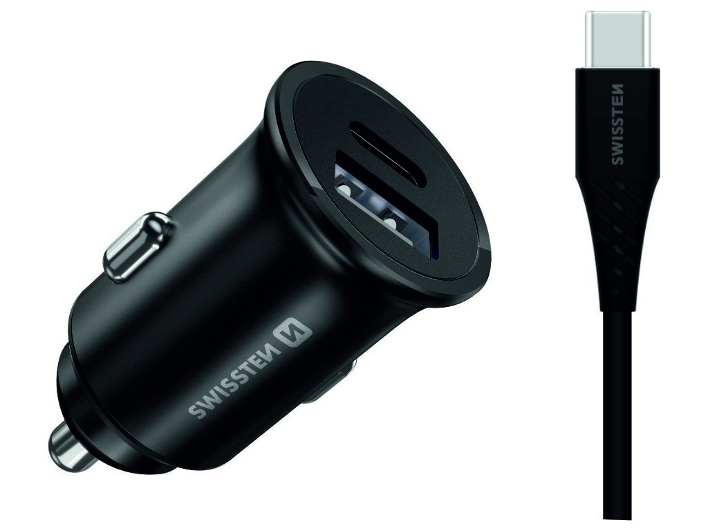 Autonabíječka Swissten 38W, Porty: USB-C + USB-A, Max. výkon USB-C: 20W, Max. výkon USB-A: 18W, Modré LED světlo, Váha: 26 g, Rozměry: Průměr 3,08 × 6,43 cm. Baleno v blistru Swissten.