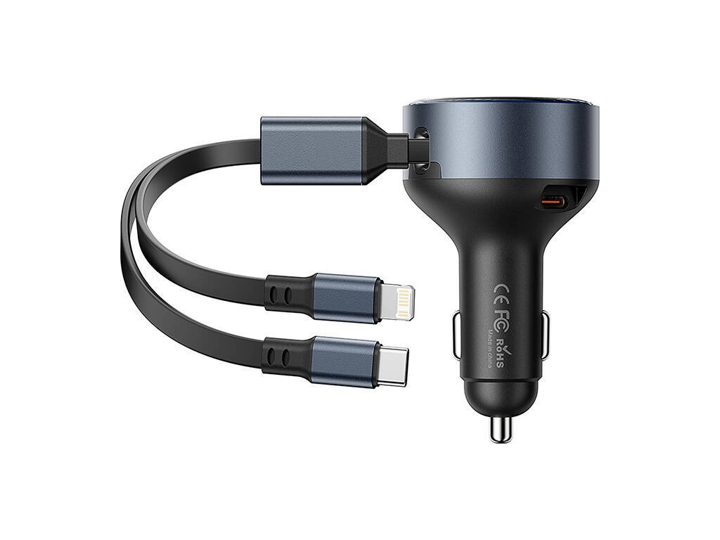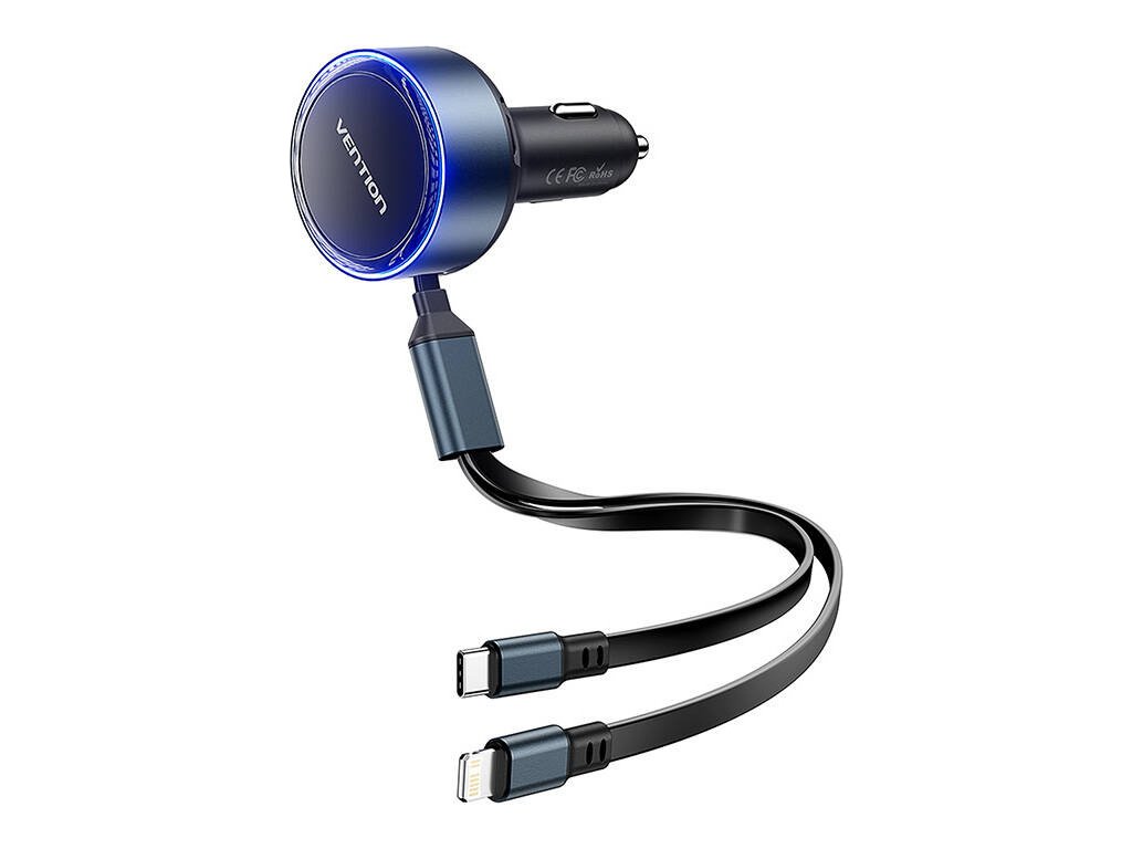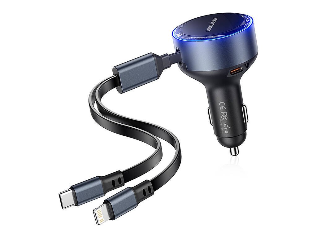 The Vention charger is a versatile solution for fast charging of three devices simultaneously, ideal for cars with 12-24V. With built-in USB-C and Lightning cables and an additional USB-C port, it provides great versatility and eliminates the mess of tangled wires.
