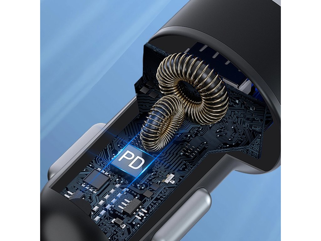 Autonabíječka Swissten 63W s kabelem, Porty: USB-C + USB-A, Max. výkon USB-C: 45W, Max. výkon USB-A: 18W, Kabel: USB-C/USB-C 1m 60W, Modré LED světlo, Váha: 28 g, Rozměry: Průměr 3,25 × 7,39 cm. Baleno v blistru Swissten.