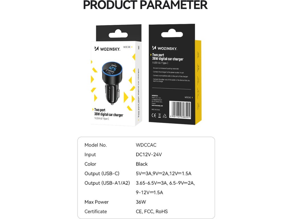 Autonabíječka Wozinsky WDCCAC vám umožní snadno a rychle nabíjet telefon, chytré hodinky nebo bezdrátová sluchátka během jízdy. Má dva výstupní porty: USB-C a USB-A, takže je kompatibilní se všemi zařízeními, která mají napájecí kabel kompatibilní se standardem USB. Nabíječka má vestavěné ochrany, včetně: nadproudu, přepětí a přehřátí. Automaticky upravuje proud podle připojeného zařízení. Podporuje protokoly rychlého nabíjení Power Delivery a Quick Charge 3.0. Nabíječka má digitální displej, který v reálném čase poskytuje informace o parametrech nabíjení.