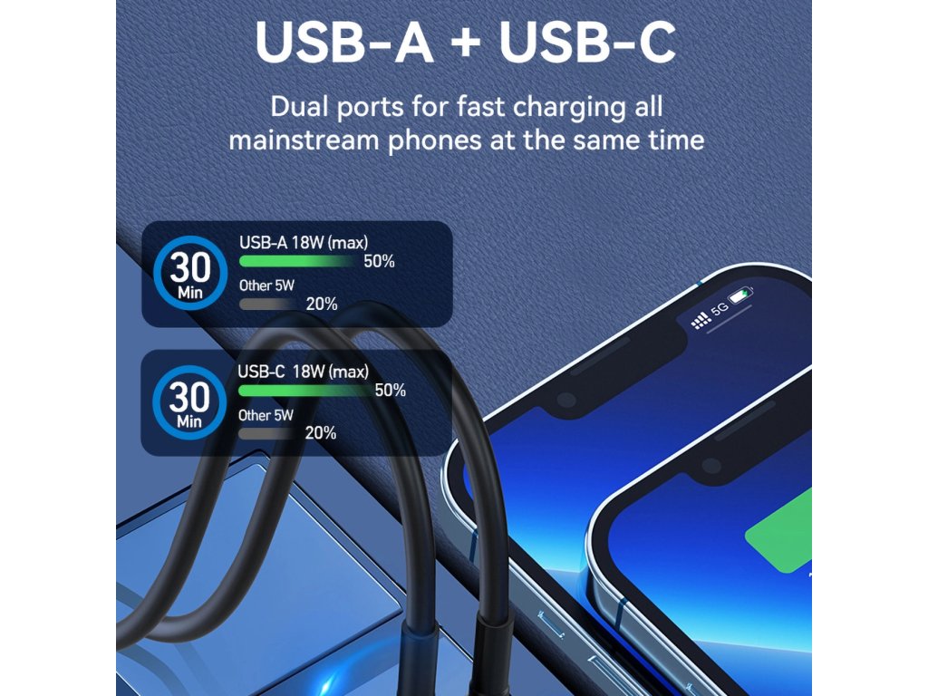 - Funguje s téměř každým mobilním zařízením. Díky použití standardních portů USB-C a USB-A je nabíječka kompatibilní s většinou zařízení.