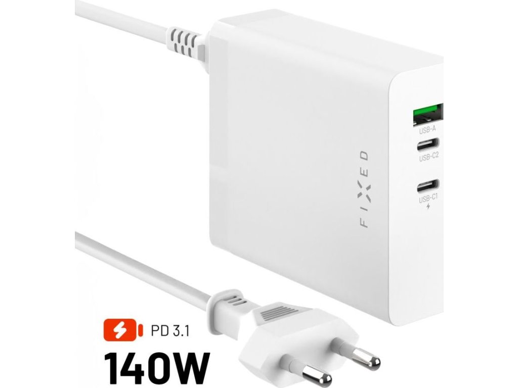 Síťová GaN nabíječka FIXED Charging Station s 2xUSB-C a USB výstupem, podpora PD 3.1, 140W, bílá