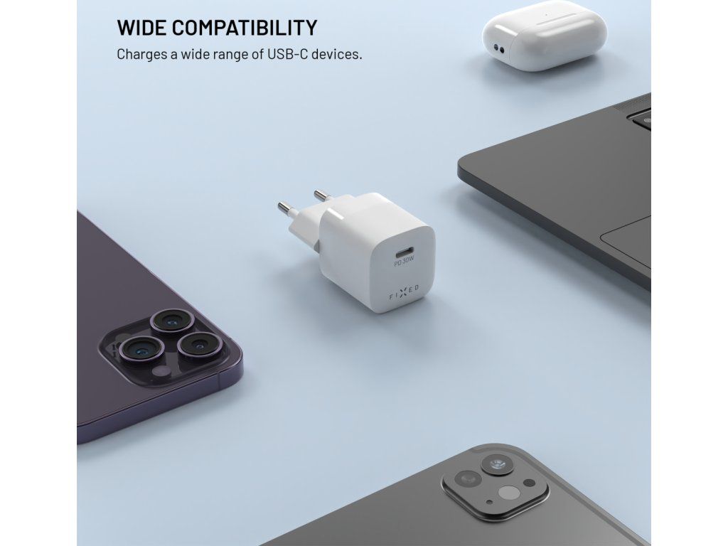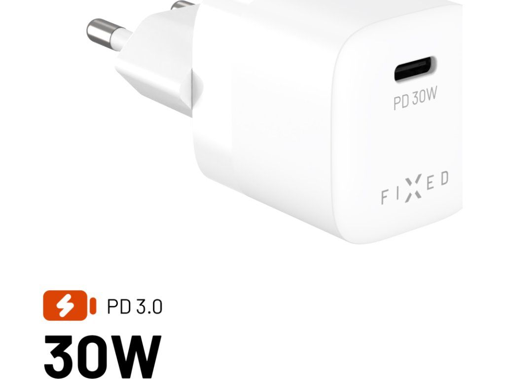Síťová GaN nabíječka FIXED Mini s USB-C výstupem a podporou PD, 30W, bílá
