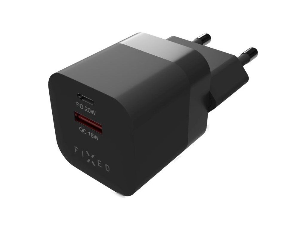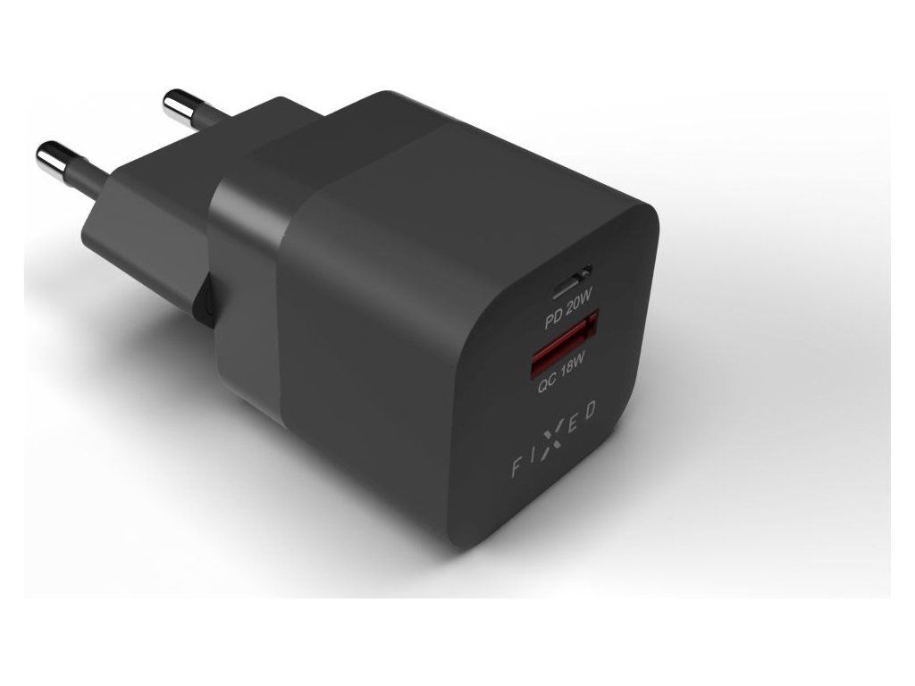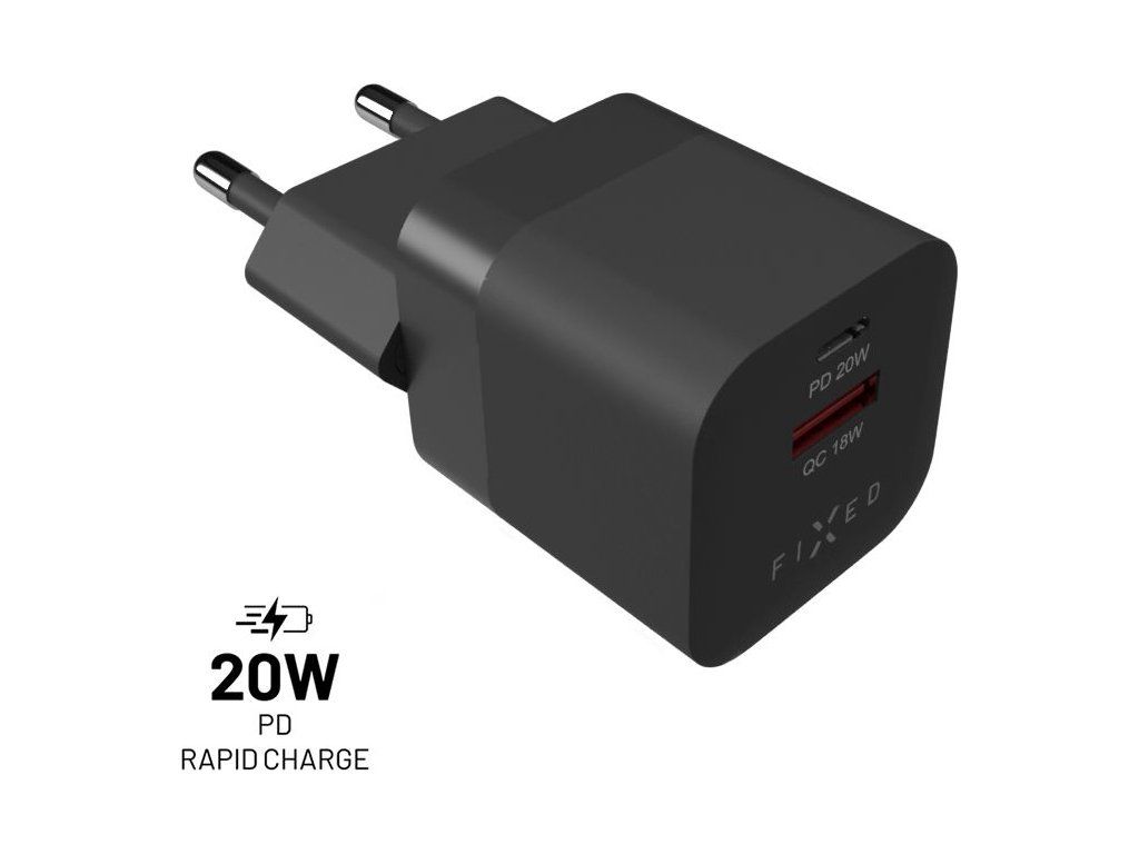 Síťová nabíječka FIXED Mini s USB-C a USB výstupem, podpora PD a QC 3.0, 20W, černá