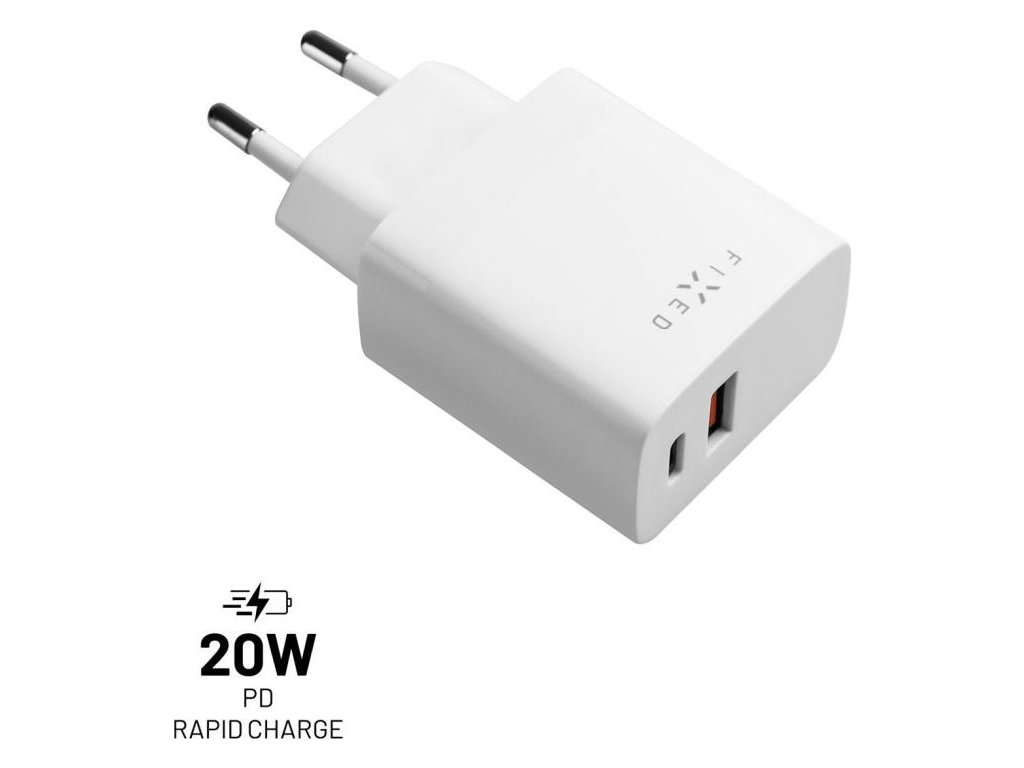 Síťová nabíječka FIXED s USB-C a USB výstupem, podpora PD a QC 3.0, 20W, bílá