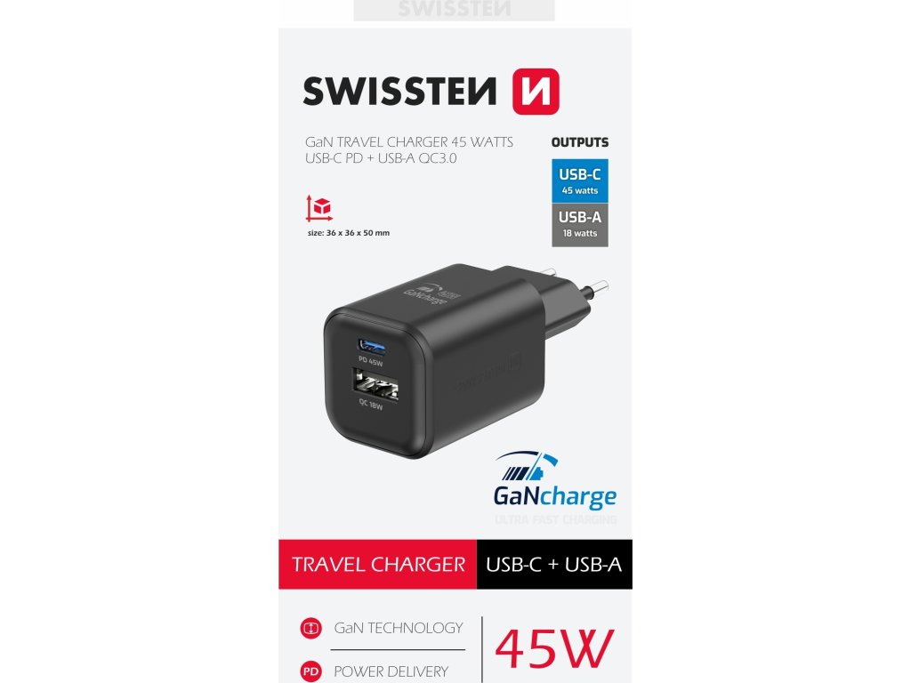 SWISSTEN SÍŤOVÝ ADAPTÉR GaN 1x USB-C 45W PD + 1x USB-A 18W QC ČERNÝ