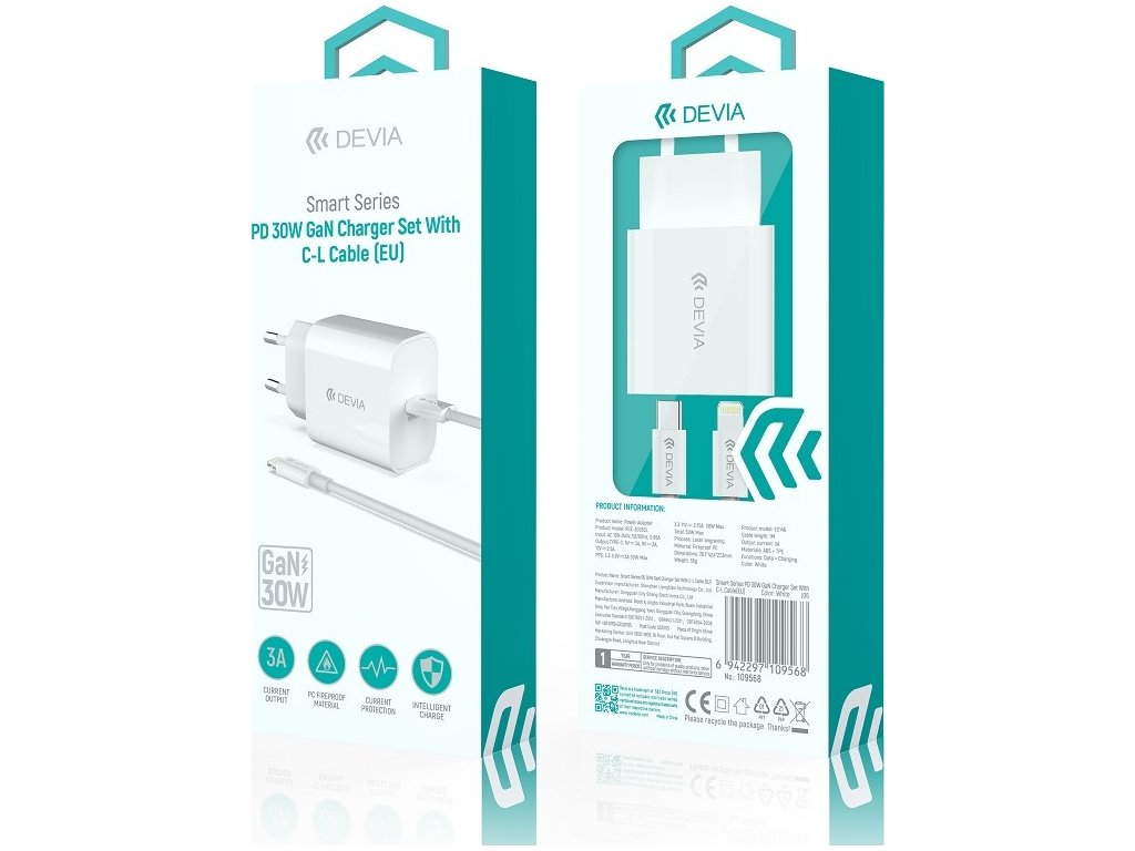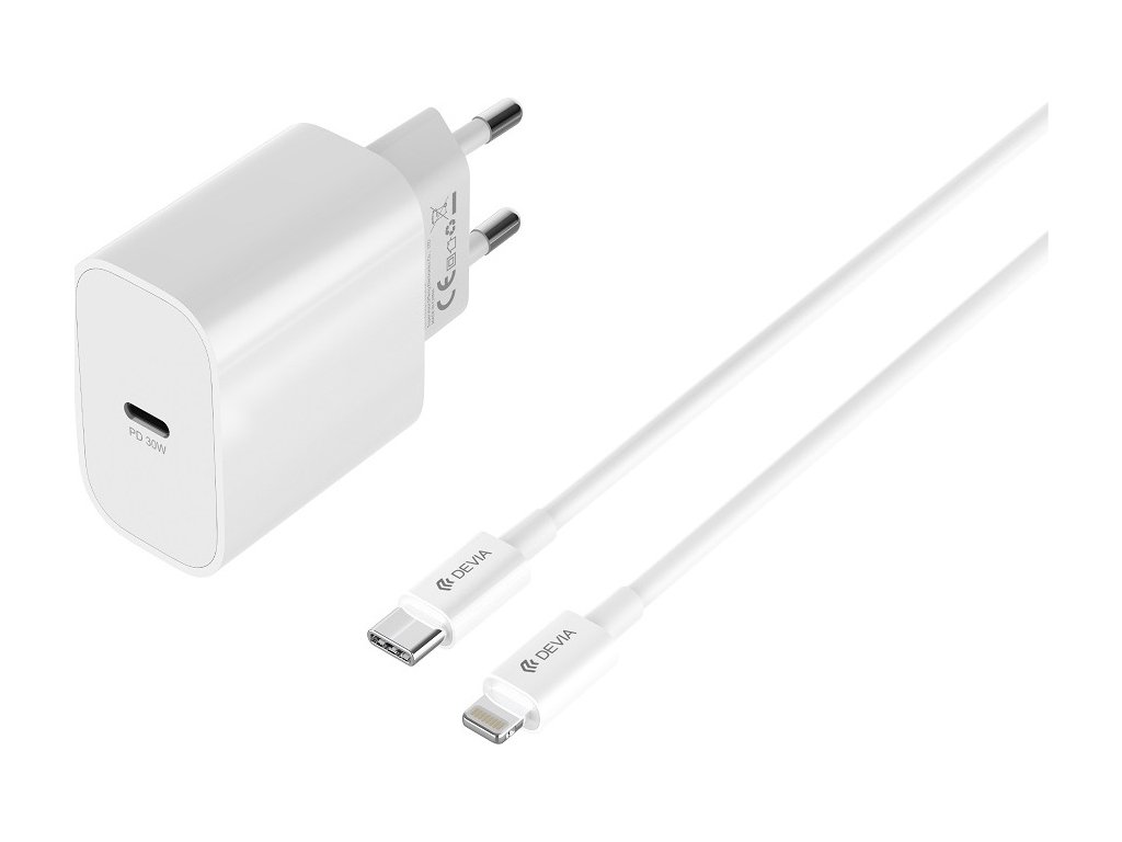 Devia síťová nabíječka Smart PD GaN 30W 1x USB-C bílá + kabel USB-C - Lightning