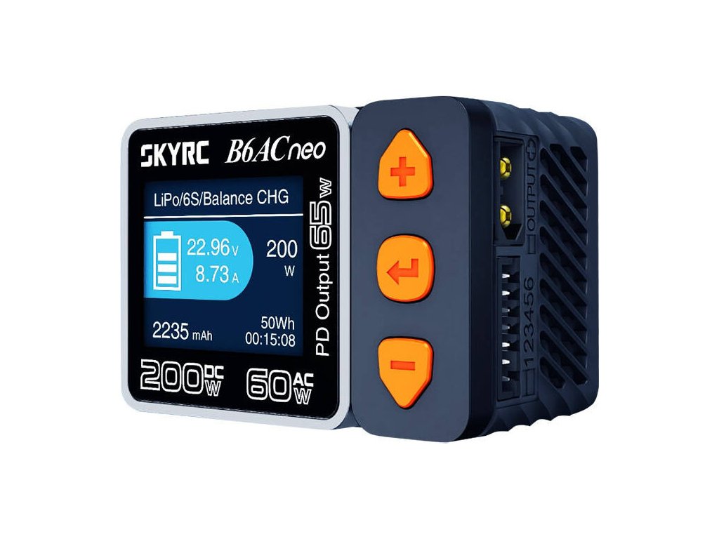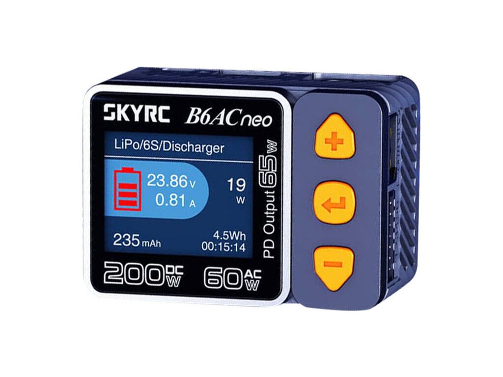 Nabíječka SkyRC B6AC Neo vás překvapí svými obrovskými možnostmi. Dokáže nabíjet baterie výkonem až 200 W (stejnosměrný proud) nebo 60 W (střídavý proud), stejně jako je vybíjet a monitorovat jejich stav. Vyniká působivým výkonem a tichým provozem a díky technologii GaN je mimořádně kompaktní, což usnadňuje její přepravu. Zařízení je vhodné i pro použití jako běžná nabíječka chytrých telefonů nebo notebooků a poskytuje výkon až 65 wattů.