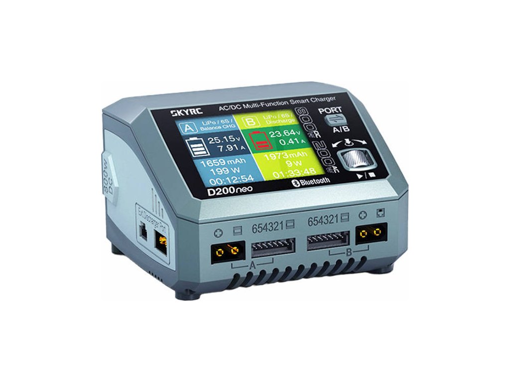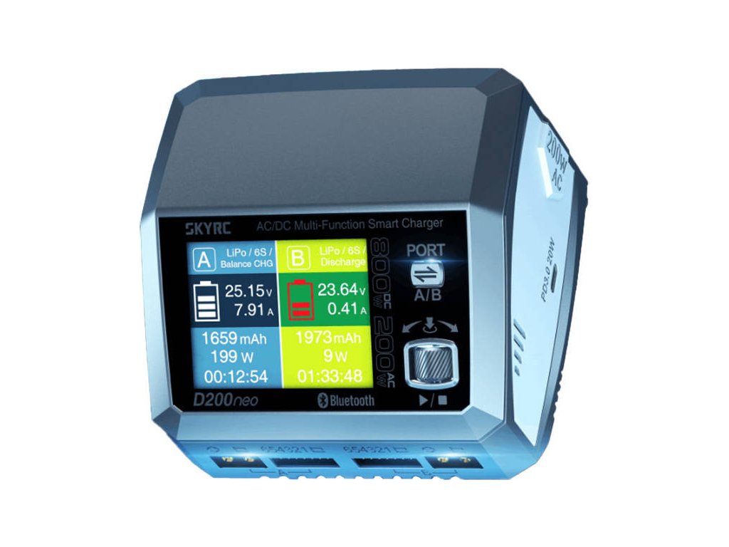 Zařízení SkyRC je vybaveno dvěma porty, které fungují nezávisle a zajišťují efektivní a současné nabíjení dvou baterií. Zařízení D200neo navíc nabízí možnost volby mezi vstupem střídavého a stejnosměrného proudu, čímž se přizpůsobí různým scénářům. V režimu střídavého proudu poskytuje nabíjecí výkon až 200 W, zatímco v režimu stejnosměrného proudu se výkon zvýší až na 800 W. Kromě toho můžete zvolit nabíjení stejnosměrným proudem s výkonem 800 W pro dosažení nejvyšší účinnosti nebo použít nabíjení střídavým proudem s výkonem 200 W a přizpůsobit tak jeho výkon svým specifickým potřebám. Model D200neo představuje absolutní revoluci ve světě RC nabíječek.