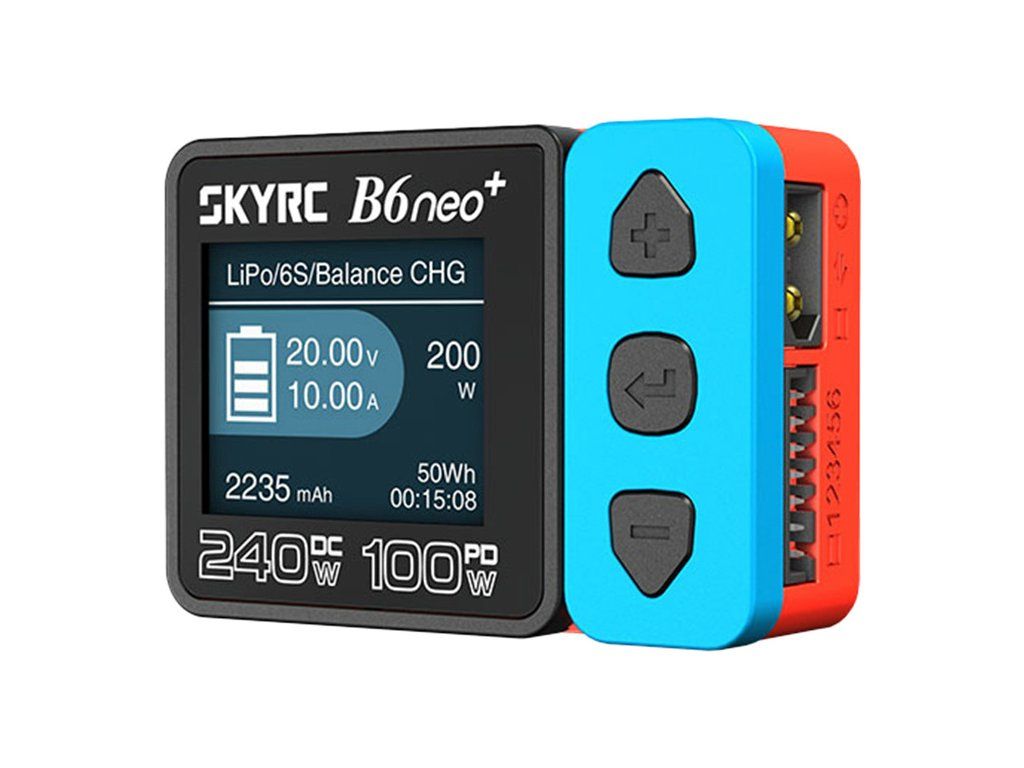 SkyRC B6neo+ je navržen s ohledem na mobilitu. Plastové pouzdro z PC-ABS V0 je lehké a odolné a díky svým malým rozměrům se snadno vejde do tašky na modely nebo batohu. Navzdory svým kompaktním rozměrům nabízí nabíječka nabíjecí výkon až 240 W s napájením DC a až 126 W s napájením Power Delivery, což umožňuje efektivní nabíjení různých bateriových sad.