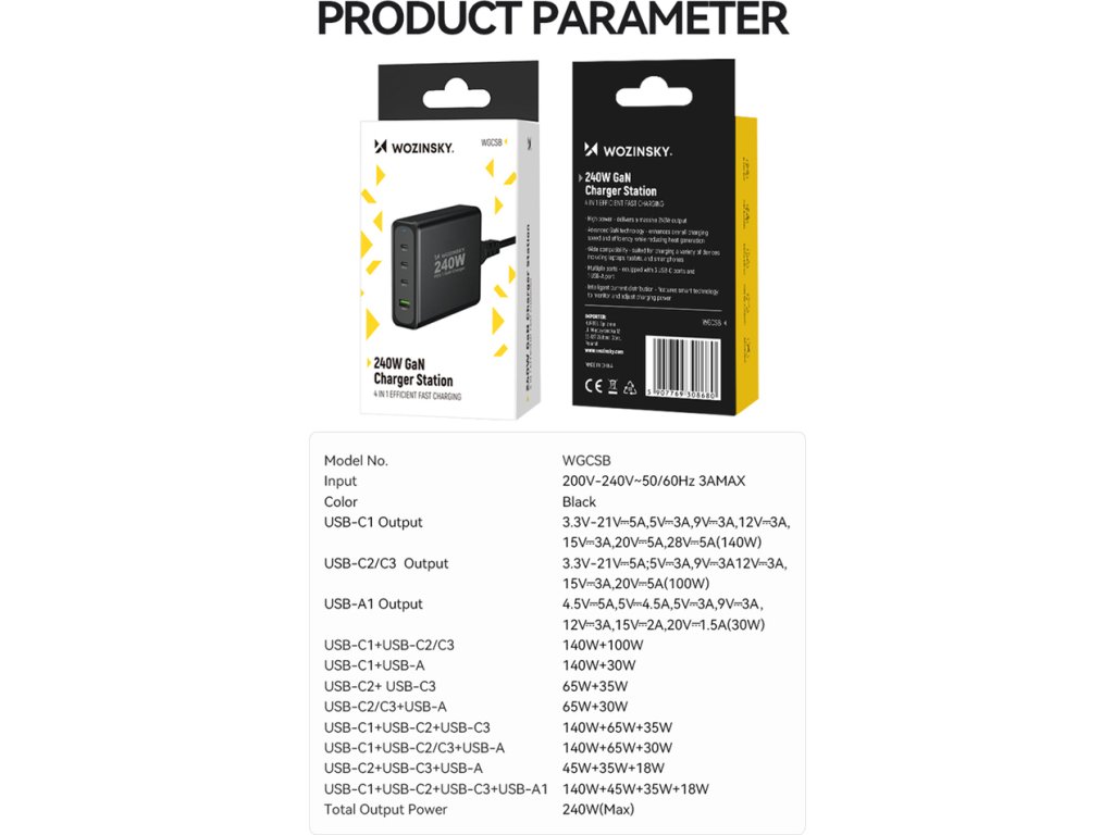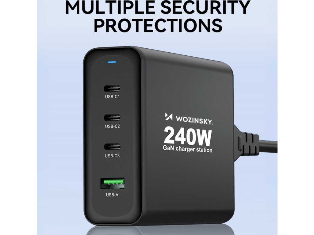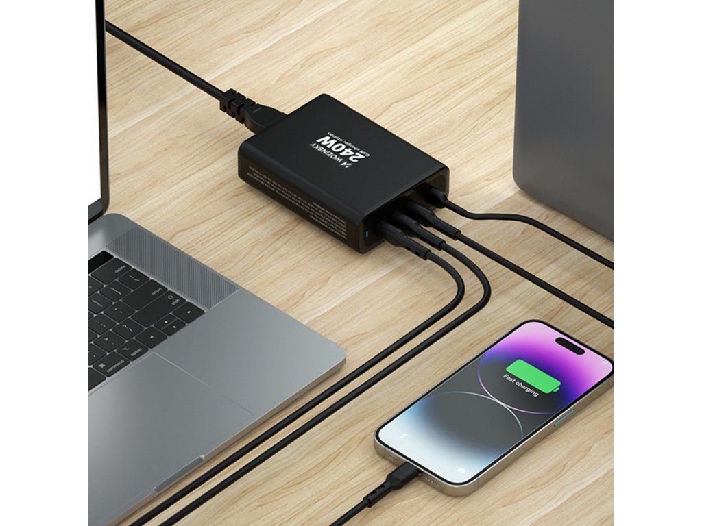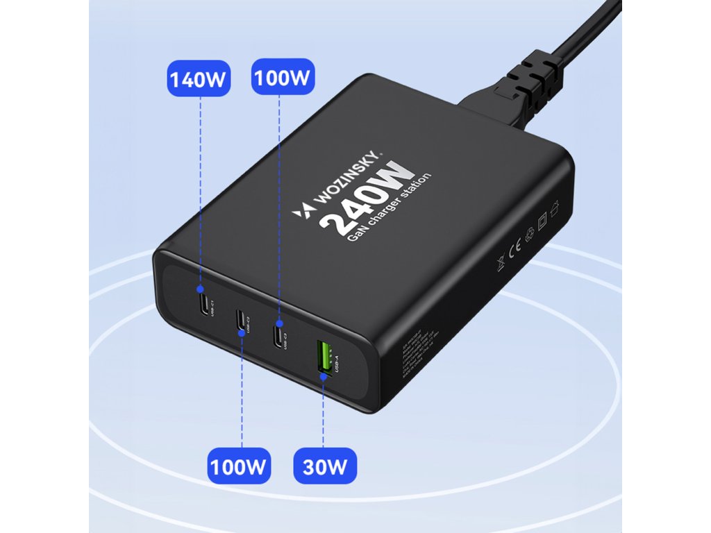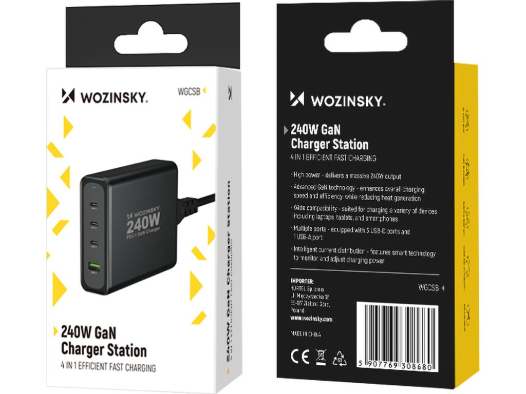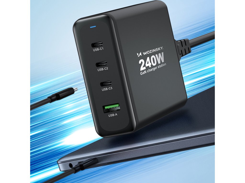 GaN Wozinsky WGCSB 240W USB-A / 3 x USB-C nástěnná nabíječka - černá