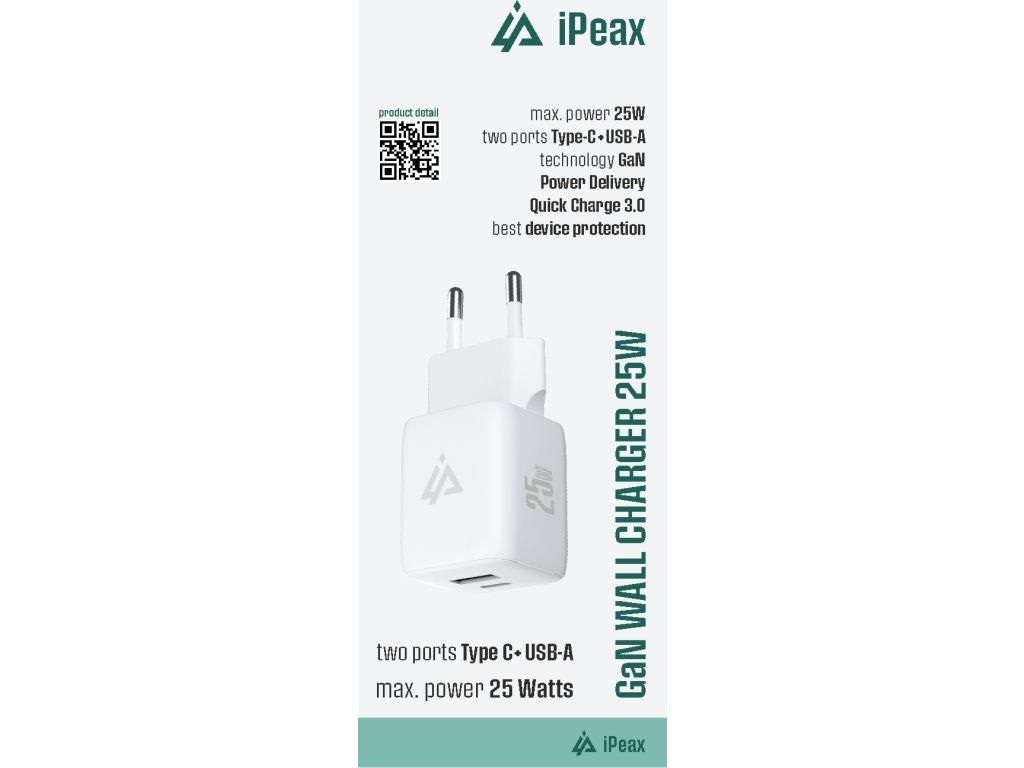 Sieťová nabíjačka iPEAX s výkonom 25 W využíva modernú GaN technológiu, ktorá zaisťuje efektívne nabíjanie pri zachovaní veľmi kompaktných rozmerov. Vďaka dvom výstupom - USB-C s podporou PD aj PPS a USB-A s QC 3.0 - ľahko a rýchlo nabijete telefóny, powerbanky aj slúchadlá.