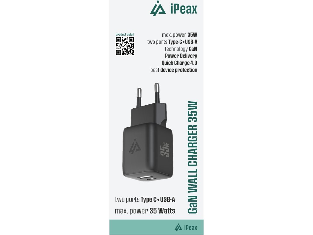 Síťová nabíječka iPEAX s výkonem 35 W využívá pokročilou GaN technologii, která umožňuje dosáhnout vysokého výkonu při minimálních rozměrech. Nabízí jak USB-C s podporou Power Delivery a PPS, tak i USB-A s rychlým nabíjením QC 4.0, což z ní dělá ideální volbu pro většinu moderních zařízení.