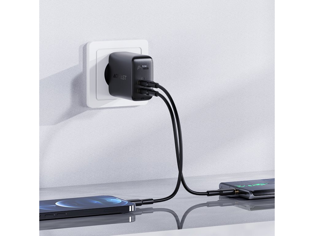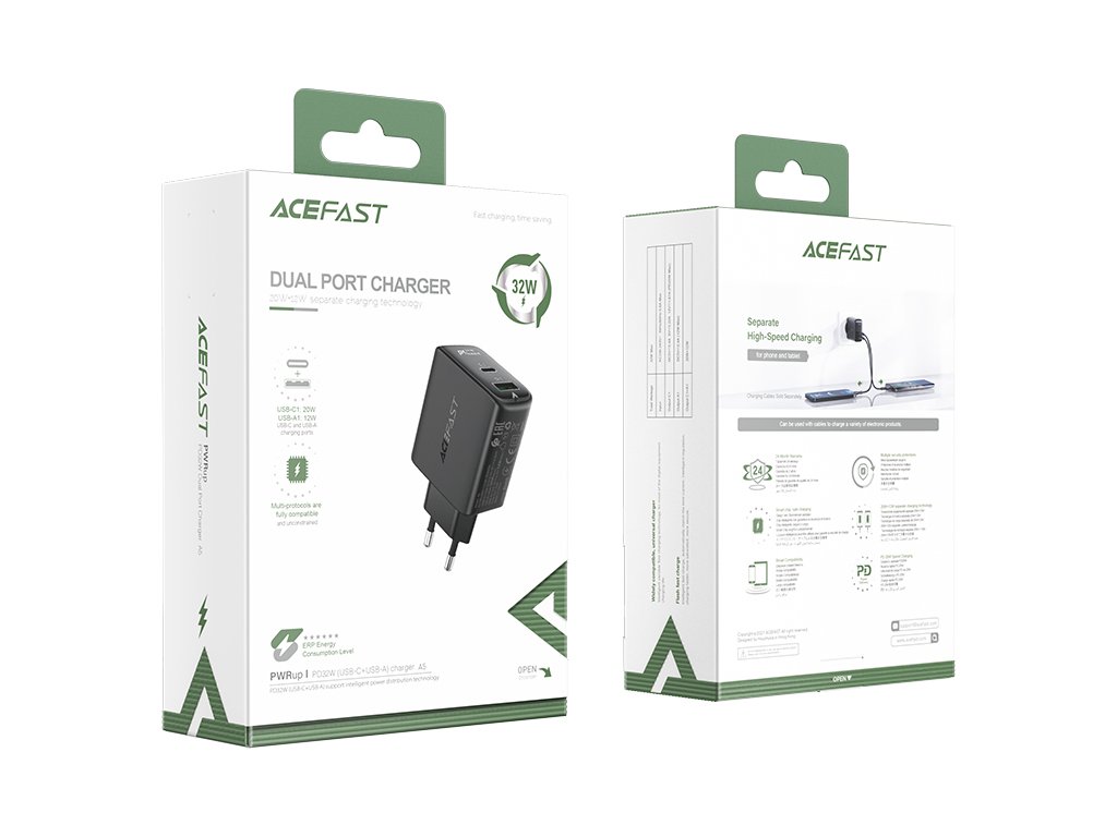 Rychlá nabíječka do zásuvky Acefast. Má celkem 2 porty, USB typu C a USB. První zástrčka USB typu C s označením „C1“ umožňuje nabíjení s maximálním výkonem 20 W a zástrčka USB A1 až 12 W. Umožňuje rychlé nabíjení, mimo jiné ve standardech PPS, Power Delivery, Quick Charge 3.0, AFC a FCP. Lze k ní připojit 2 zařízení současně. Je vyrobena z nehořlavého PC materiálu. Je vybavena mnoha ochranami, jako je přehřátí, přepětí, vysoké napětí nebo přetížení.