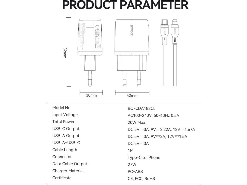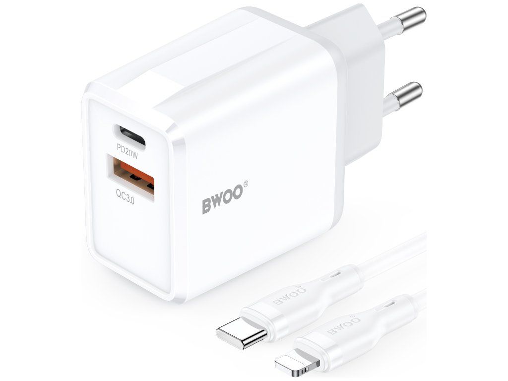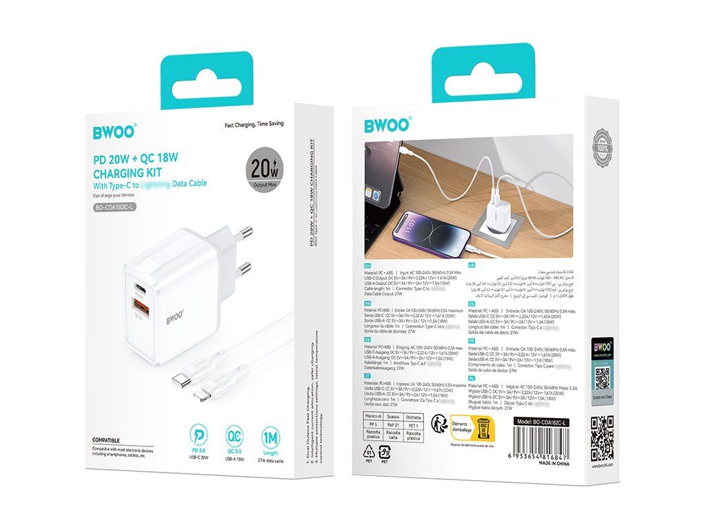 Nabíječka BWOO CDA182 QC 38W 1x USB-A + 1x USB-C s kabelem USB-C C-Lightning 1 m černá